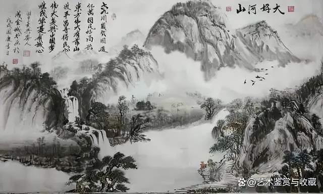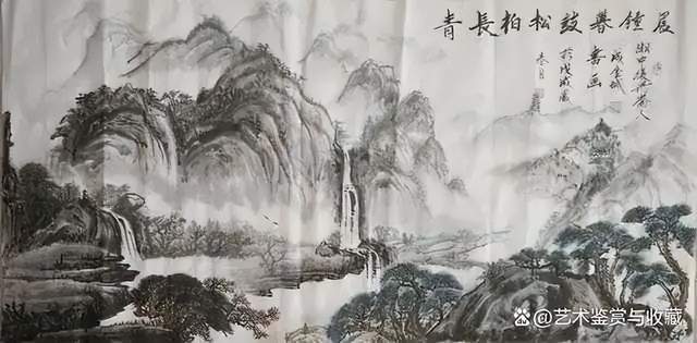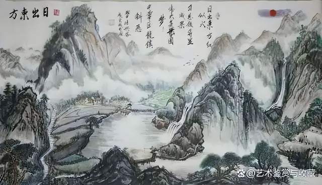 成金城的山水画,借鉴青绿山水的典型笔法,运笔老辣,既展现湖光山色,又富诗情画意的清新神韵,画面笔法细腻浑厚,近景葱翠沧碧与远处云烟缥缈相映成趣,在云烟之外,楼阁掩映的群山树影,增添画面的高远神秘之境,在山光水影中,帆影的飘动、潺潺水流增加画面动感。