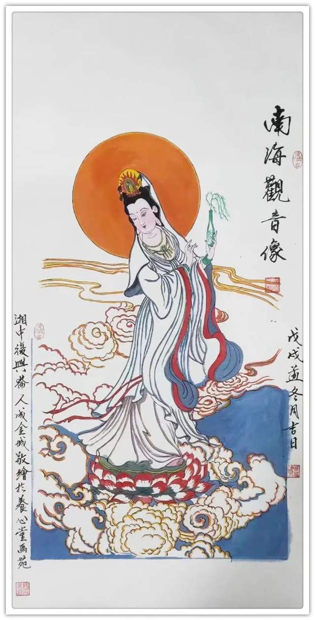 成金城,笔名金圣,1945年出生于南京,现居住于湖南湘乡。书香世家,名门望族,自幼爱好美术,无师自通。因自身信佛,擅长佛像、山水画创作。佛像擅长观世音菩萨,山水画擅长自作诗。作品远销福建、台湾地区以及东南亚国家。现为湖南养心堂书画院院长。