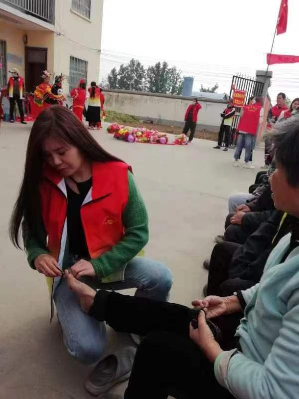 活动中,汝南县爱心公益协会的会员黄海霞、李月翘、沈楠、魏静、殷玲、娄慧、刘思思、彭林苹等拿出自己准备好的指甲剪,分别蹲在老人跟前,细心地给老人们修剪指甲和脚指甲。由于老人们的脚趾甲难以修剪,她们就低下头,从不怕脏;为了生怕剪疼了老人,她们还把老人们的脚放在自己的腿上,握住老人脚趾轻轻地、小心地剪着老人的脚趾甲。这次活动中,爱心会员们用满满的耐心在逐个给老人修剪难以修剪的脚趾甲,并给老人边聊着天、边修剪的脚趾甲,场景实在令人感动。