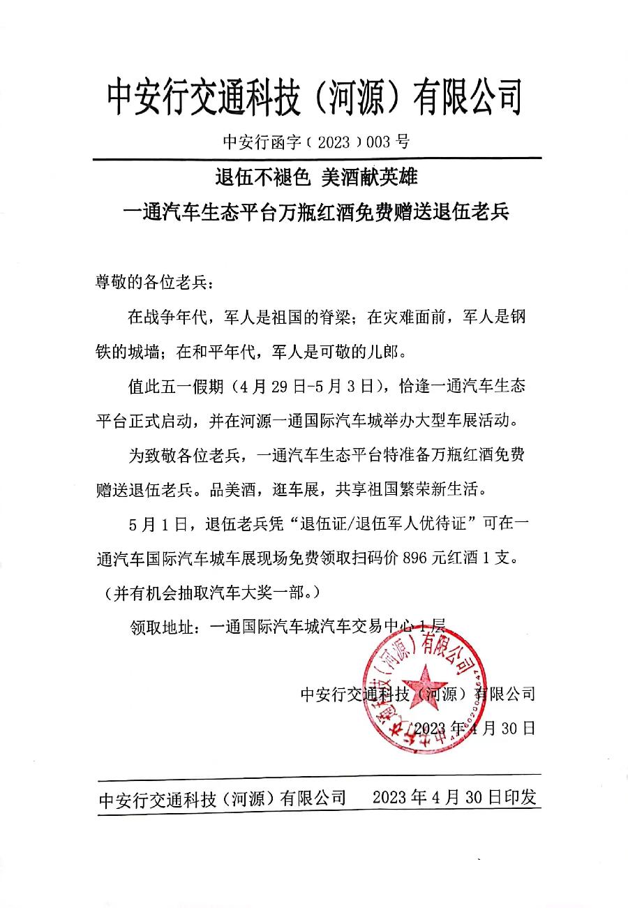 5月1日,退伍老兵凭“退伍证/退伍军人优待证”可在一通汽车国际汽车城展现场免费领取扫码价896元红酒1支。(并有机会抽取汽车大奖一部)