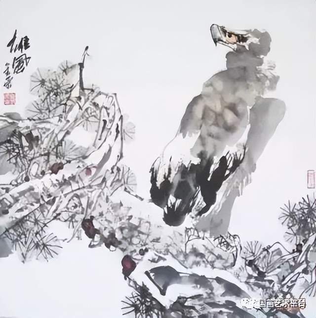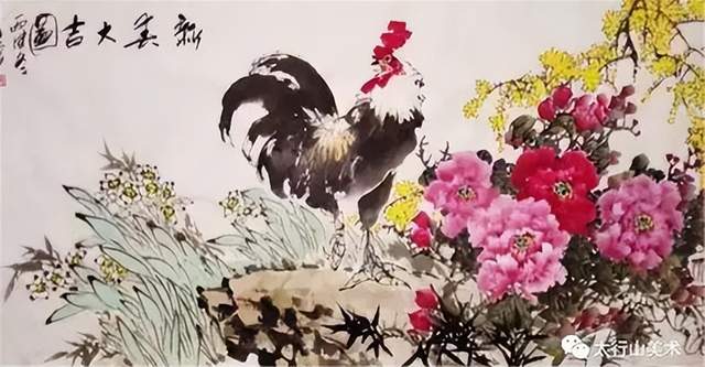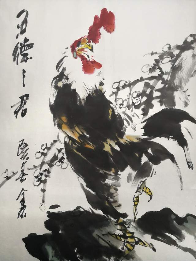 雄鹰是他喜欢的绘画题材之一,或雄踞松石,或翱翔长空。对于鹰这种动物的描绘,他笔锋犀利,纵情挥洒,整幅作品充满了刚劲的气势,在画面中用更加刚毅的线条来突出鹰的雄姿和霸气,让我们能够直观的感受雄鹰的凌烈姿态,在他的笔下,以公鸡作为主角的作品则显得充满了生活的情趣,画面柔和了许多,也更加丰富,将国画中色墨相融的技巧发挥到淋漓尽致。欣赏张金荣的国画作品,完全就是一种美的享受,是对于国画艺术的又一次膜拜。