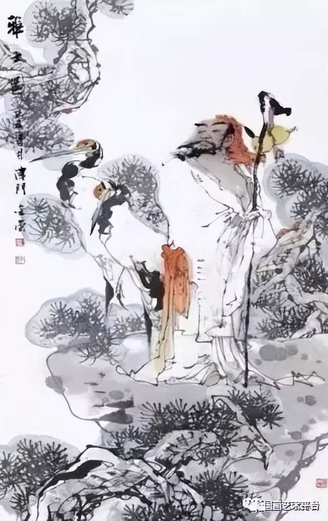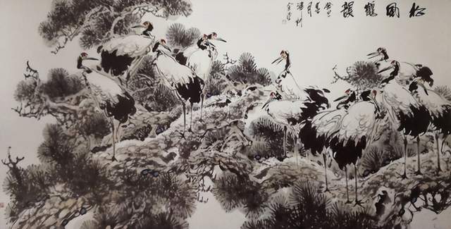 两只仙鹤栖息在松树的主干上,勾画出了人们喜闻乐见的通俗题材-健康长寿,松鹤延年。在造型刻画上,仙鹤神情安定,胜似闲庭信步,给人一种与世无争,泰然处之,安居乐业,幸福美满的感觉。最值得一提的是整个画面线条老辣而又苍润,不出干笔,多以湿笔运行,所以感觉流畅、滋润,有韵律在舞动,你的心情也会随之荡漾。张金荣的国画,可以说是纯文人画。有着丰富的文化内涵,古朴、典雅、厚重、沧桑,饱含丰富的中国古典哲学。