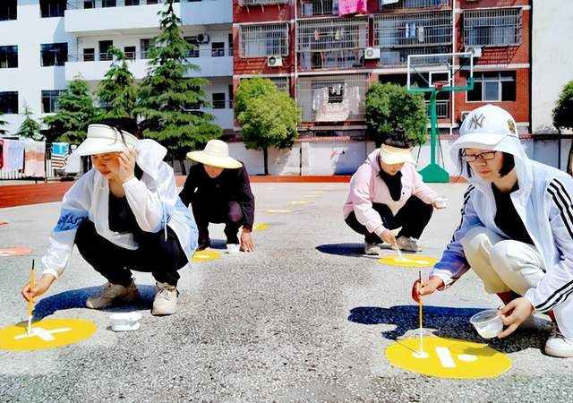 田老师告诉记者:“今天,经过老师们奇思妙想,脚踏实地、一个个描绘在操场上诞生了;明天,面对地上标记,孩子们站队几乎感受一下就会了”。
