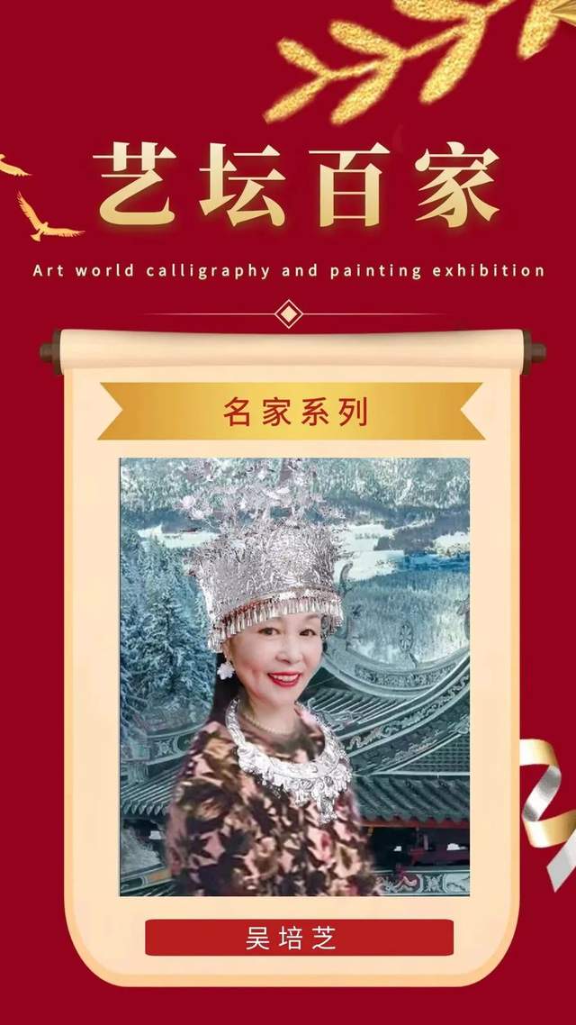 吴培芝,女,1955年出生于湖南省怀化市新晃侗族自治县,祖籍贵州省玉屏县,号夜郎山人。中国著名画家,中国书画院高级院士,国家高级美术艺术传承师,国际一级美术师,国家一级书画家,国家高级工艺美术师,中华国礼艺术专家,中国书画行业研究员,--2017年参加中央电视台举办的华人春晚,并获优秀艺术家光荣勋章。--2012年5月在香港举办了个人画展。--2019年9月28日又以浓墨重彩,墨彩交融的独特画风在北京李可染画院举办了个人画展,深得专家学者高度贊扬。--2021年5月由国家邮政局国家集邮网再次以(杰出艺术名家)光荣称号出版发行个人肖像邮票。--2021年9月1日再次接受中央电视台CCTV《名家经典对话》专访报导。2022年3月18日参加亚洲第五届慈善公益事业大典会议,获2021年艺坛领军人物荣誉称号称号奖杯。2022年8月17日参加第二十二届世纪大风采会议,又获得我国艺坛书画领军人物奖杯,并获得中华艺术爱国形象大使奖杯和勋章。2022年九月艺术作品在北京《艺脉相承》多号地铁线巡回展播。其作品已入编《世界名人录》和《中国美术史》名人录。2022年由中国国家艺术促进会,中国美协,中国书协及国家人才库颁发的《人民艺术家》荣誉奖牌。2023年2月又获中国国际八大部门授予的《精忠报国》艺术家荣誉称号。