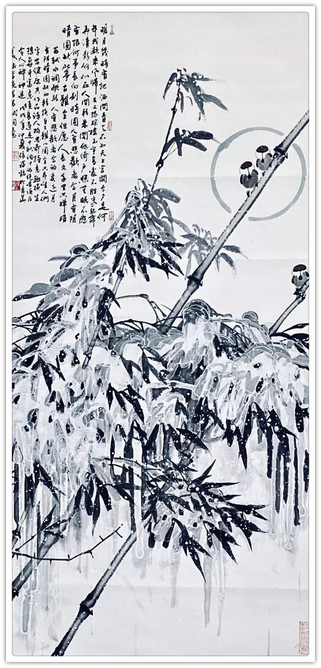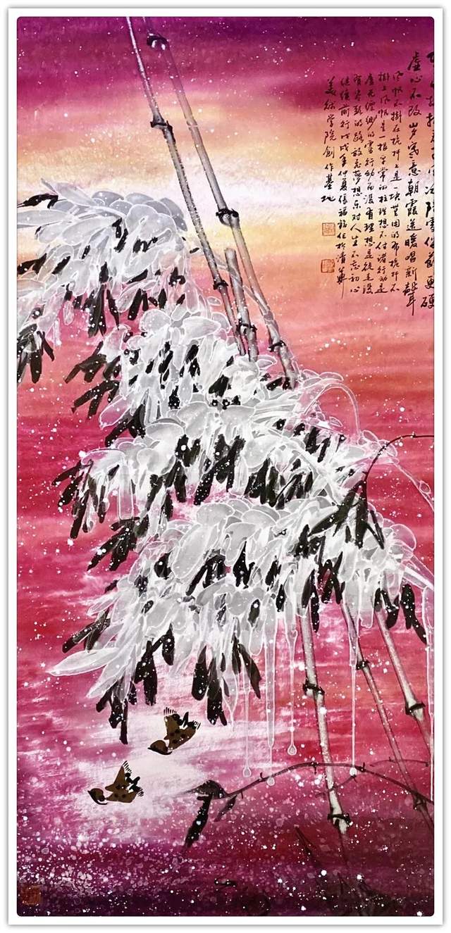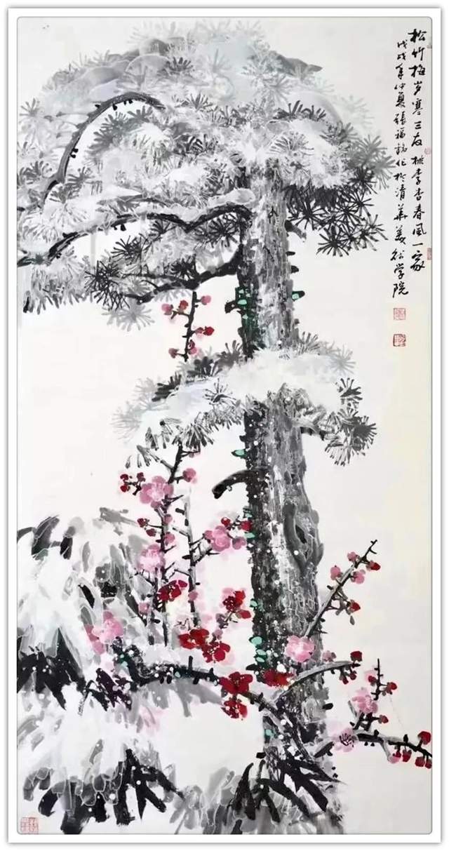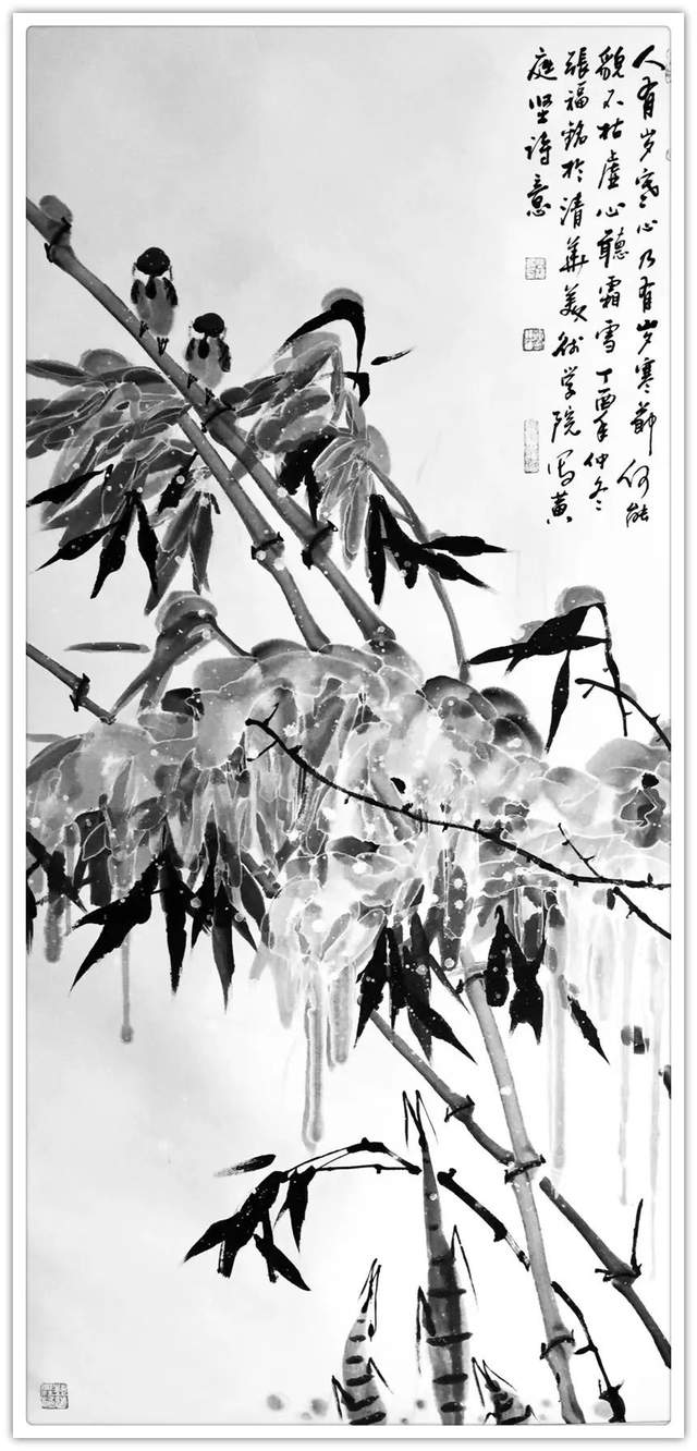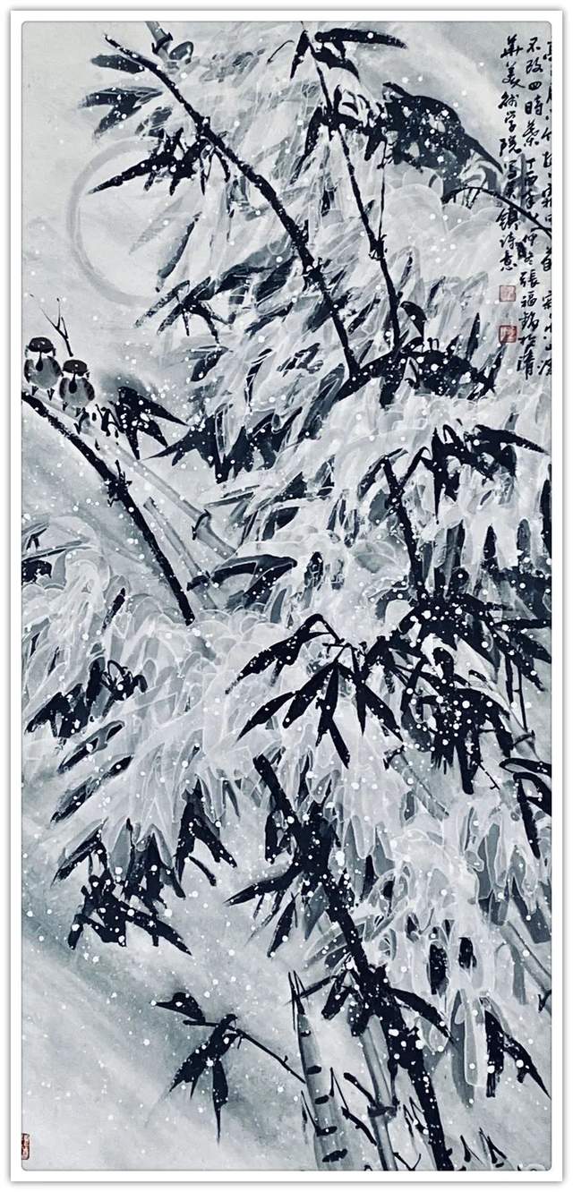 仔细梳理张福铭先生的艺术生涯与发展轨迹,将其归为军旅画家未为不可。他有着长期扎根军营的人生阅历与生活体验,这锤炼了他一种坚韧不拔、傲然独立的性格与精神。因此才使得我们能够观赏到其作品中大量描绘凌风傲骨、雪竹摇曳、苍松立雪、梅花怒放等画境,这显然是具有明显积极寓意之象征性作品。与此同时,张福铭的作品虽取材于传统花鸟题材,但技法却极具个人风貌与独特探索精神。这与其常年坚持不懈严格以一位优秀军人,优秀书法家的标准要求自己是分不开的。回望画史,优秀的中国画家尤其花鸟画家往往都是成绩不凡的书法家,张福铭显然极为明了其中三昧,因而才使我们感受到其作品中不俗的笔墨情韵。上述因素使得其用笔厚重而不凝滞,温润而不轻浮、细腻而不琐碎,章法布局、行笔构图亦多考量所绘题材之典型寓意而极富变化感。