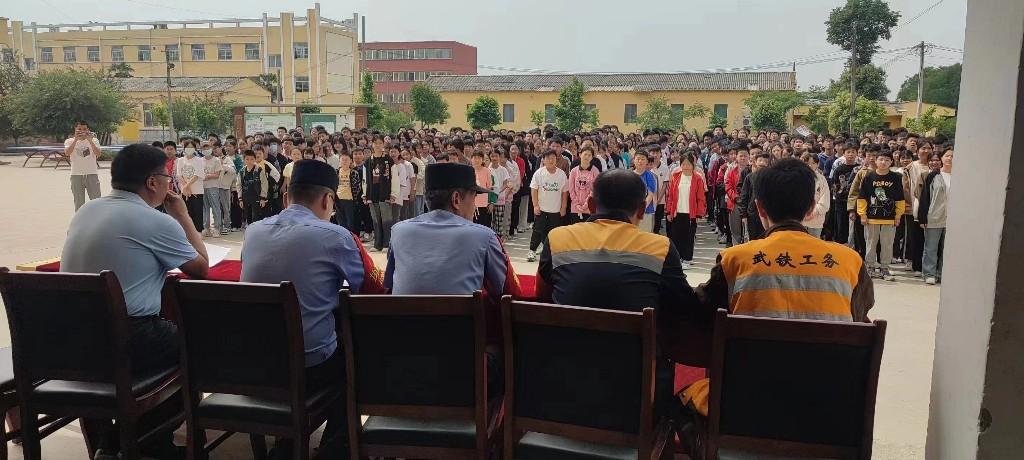 为深入贯彻落实武汉铁路公安处“利剑除患,携手护路”“三清”、春季线路治安整治行动工作要求,结合“5.26"我爱路”主题宣传日活动,为提升高铁沿线中小学生法制安全意识,5月25日上午,驻马店西车站派出所副所长刘永强联合驻马店西客专线路车间、驻马店西客专供电车间、武汉同宁保安服务公司等单位前往驻马店市遂平县褚堂初级中学进行高铁法制安全宣传教育活动。