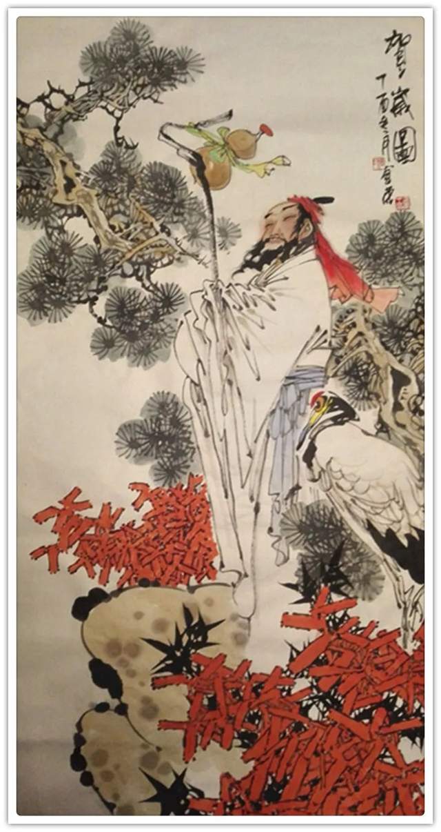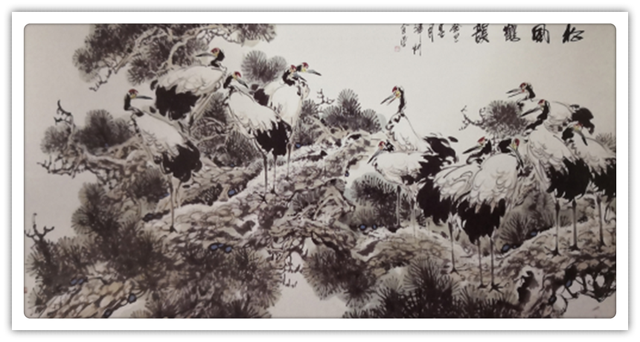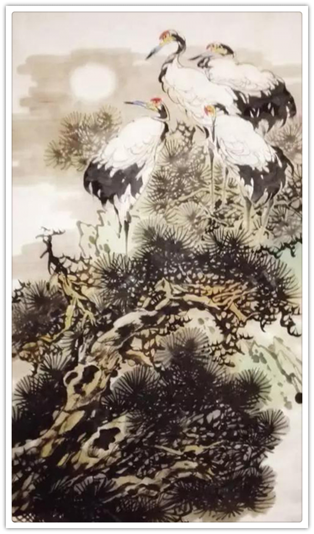 两只仙鹤栖息在松树的主干上,勾画出了人们喜闻乐见的通俗题材-健康长寿,松鹤延年。在造型刻画上,仙鹤神情安定,胜似闲庭信步,给人一种与世无争,泰然处之,安居乐业,幸福美满的感觉。最值得一提的是整个画面线条老辣而又苍润,不出干笔,多以湿笔运行,所以感觉流畅、滋润,有韵律在舞动,你的心情也会随之荡漾。张金荣的国画,可以说是纯文人画。有着丰富的文化内涵,古朴、典雅、厚重、沧桑,饱含丰富的中国古典哲学。