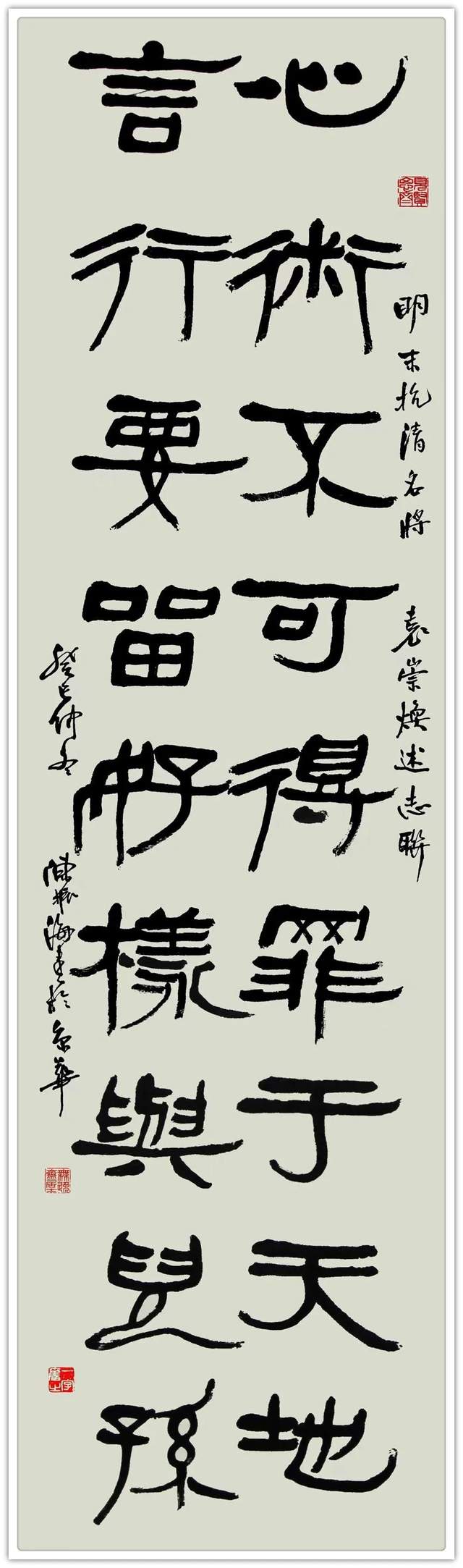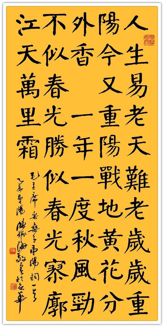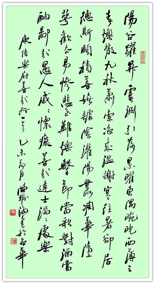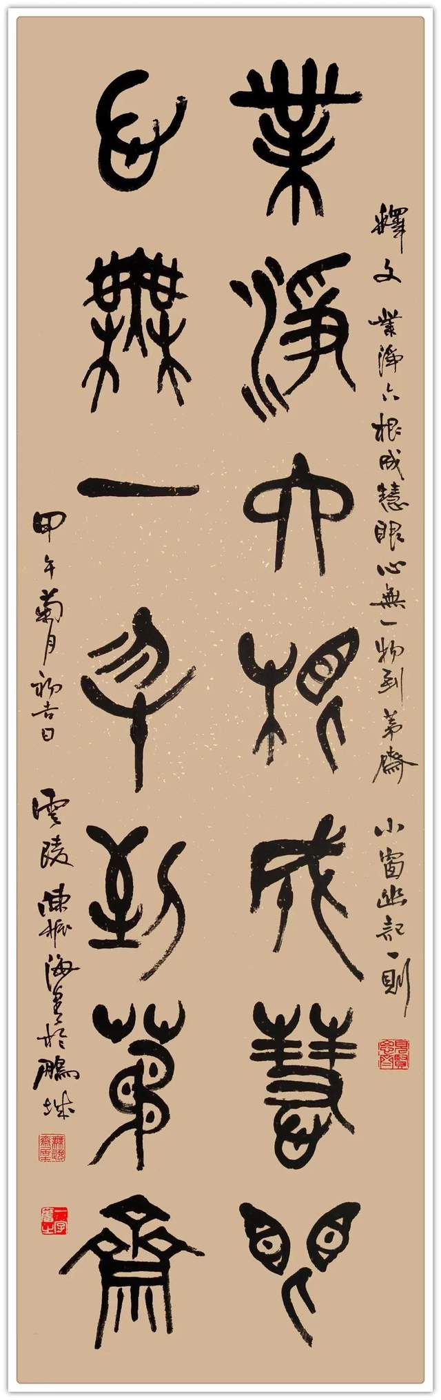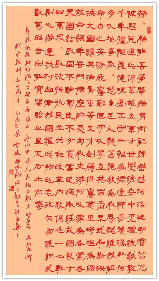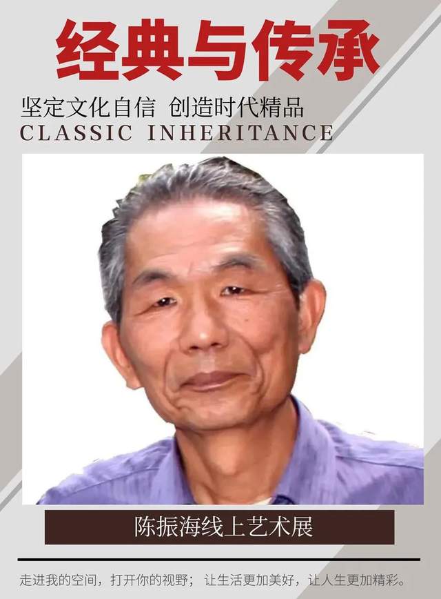 陈振海 1950 年 12 月生于开漳祖地福建省云霄县云陵镇开漳圣王故居燕翼宫,为开漳圣王陈元光四十二世裔孙。七岁起自学书法,积六十余年之努力,遂至人书俱老、五体兼精,成为一位从知青和重体力劳动者中秀出的集大成书法艺术大家。2002 年曾为日本国百年名校明治药科大学书写百年校庆学歌碑并到该校讲学办展。该碑已成为视察、访问、游览该校之皇室成员、政要、学者、游客必到的地标景观。自 2015 年以来先后被遴选为“中国翰墨传承巨匠”、“中国书坛领军人物”、“中国书画形象大使”、“中国文化艺术国际传播大使”、“艺术巅峰人物”、“2023福布斯中国名人”、“中国国宾礼艺术顾问”、“国家美术师及润格评审委员会艺术顾问”。艺术传略载入《百年中国书画史》、《中国美术史》、《中国美术通史》,与十几位当代书画界领袖人物暨艺术流派代表性艺术家合编作品集十多部,出版《翰墨中华名家档案——陈振海作品集》一部。为当代书坛最具影响力和作品升值空间的实力派书法艺术大家之一。篆书作品李白《将进酒》诗句在 2019 年 7 月20 日中欧国际拍卖会上以 EUR22425 成交。