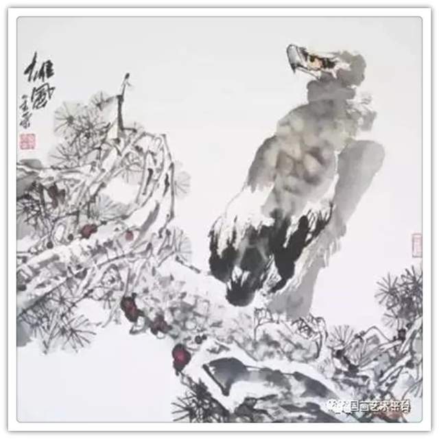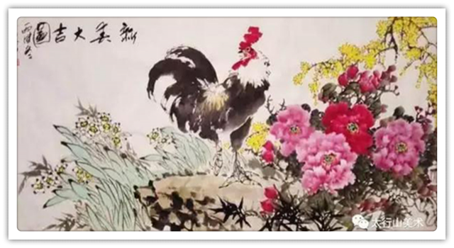 雄鹰是他喜欢的绘画题材之一,或雄踞松石,或翱翔长空。对于鹰这种动物的描绘,他笔锋犀利,纵情挥洒,整幅作品充满了刚劲的气势,在画面中用更加刚毅的线条来突出鹰的雄姿和霸气,让我们能够直观的感受雄鹰的凌烈姿态,在他的笔下,以公鸡作为主角的作品则显得充满了生活的情趣,画面柔和了许多,也更加丰富,将国画中色墨相融的技巧发挥到淋漓尽致。欣赏张金荣的国画作品,完全就是一种美的享受,是对于国画艺术的又一次膜拜。