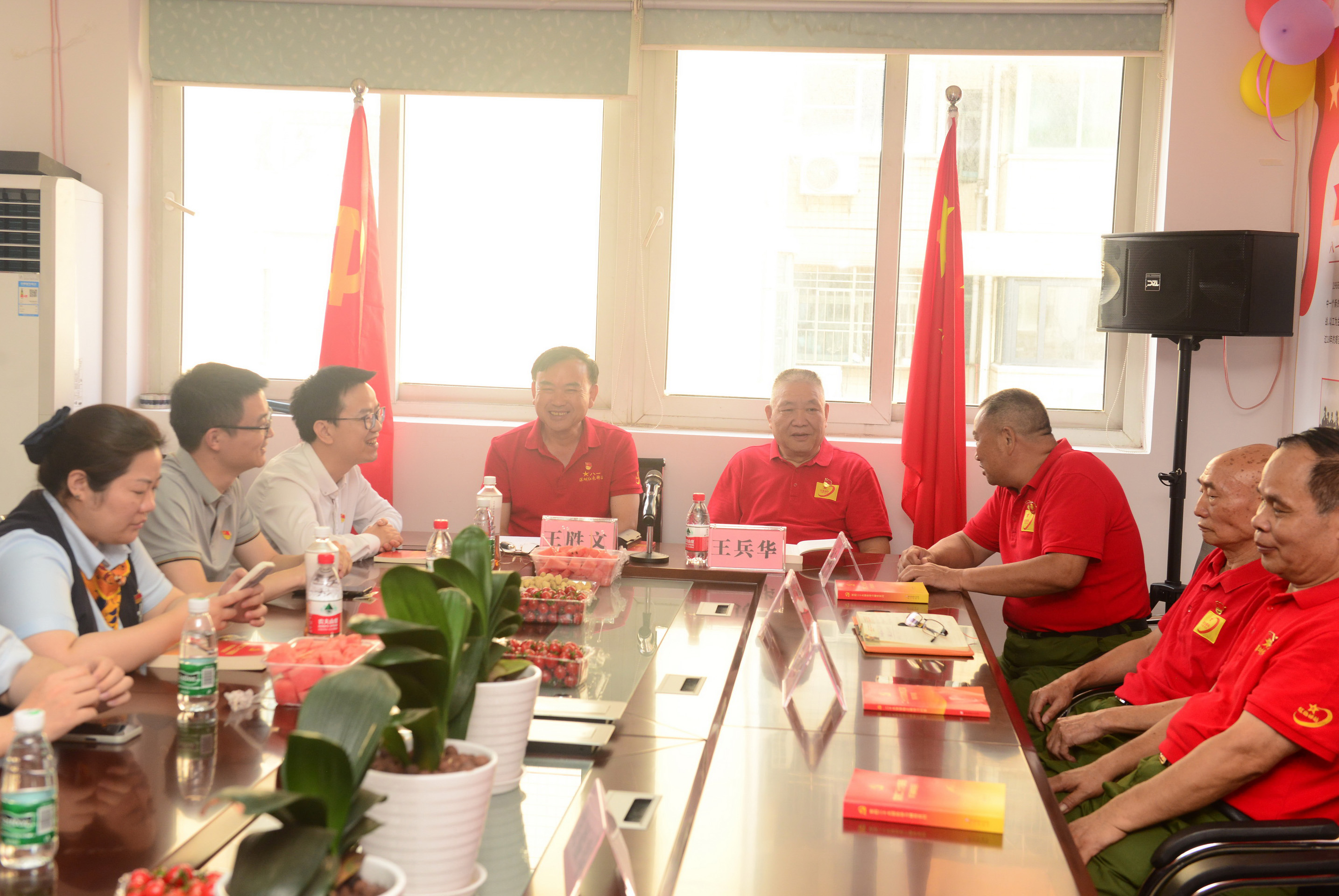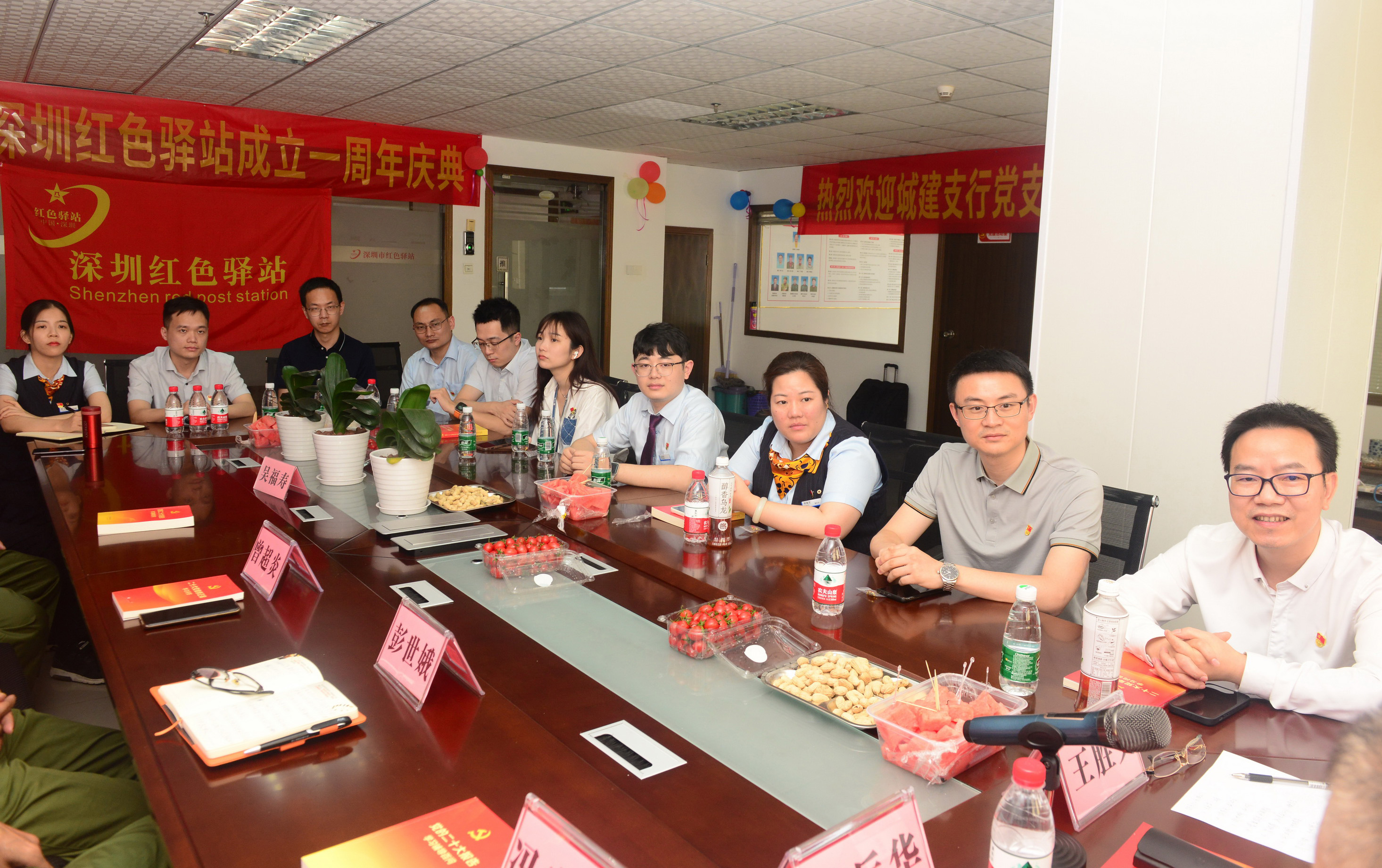 下午3:30,深圳红色驿站党支部书记王胜文,站长王兵华,副站长冯忠兴、彭世娥,副秘书长曾超炎,老兵代表吴福寿、刘明胜及深圳市观赏石文化艺术协会党支部书记卢兴求、深圳市文化音乐中心刘智老师等热烈欢迎深圳建行住房城市建设支行党支部书记、行长梁玻尔一行。