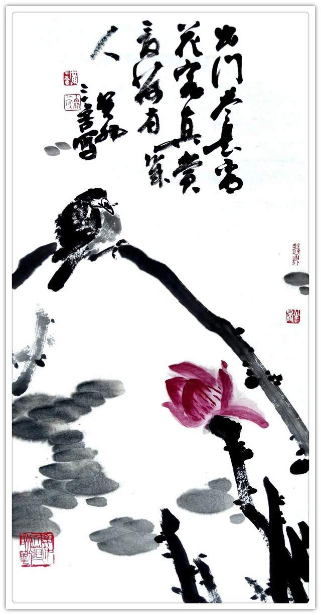 夫诗书画印之完美融合,乃古今画人追求之艺术高境也。纸帛方寸间之丹青,乃画者之笔墨情趣与文化修养呈现。南宋米友仁于《题新昌戏笔图》言:“画之为说,亦心画也。”国画家黄三舍善写意花鸟,其所写之玉兰夏荷,花竹禽鸟,时而素淡轻描,时而墨饱色酣;既有阔笔淋漓,又见精妙细写。三舍之画,总现其朴素之情感,执着之情怀耶。
