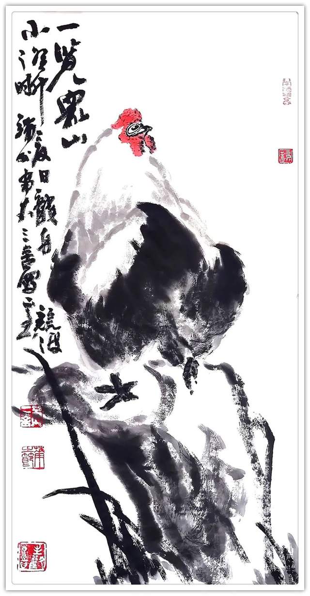 有一幅公鸡图充满了情趣,充满画面的公鸡身体硕大却不沉重,夸张的量感也动感十足,令观者感叹生命力的勃发是平等的。