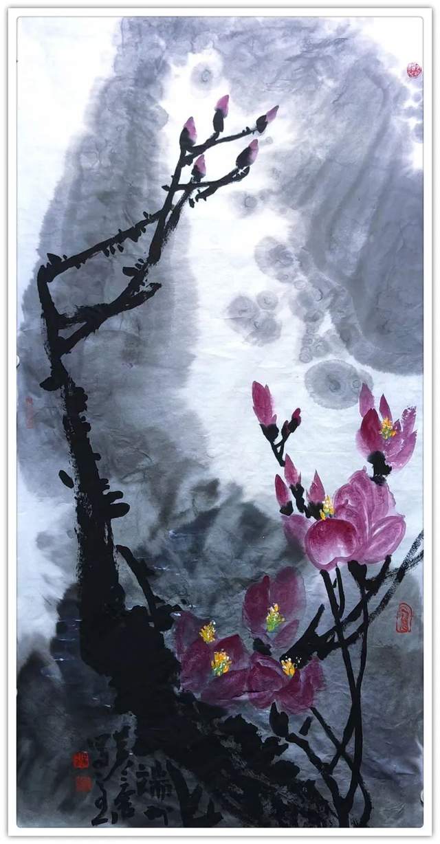 古人言 “少年好学,终可成也。”三舍垂髫之年学艺,现及花甲,仍坚持不懈,实属难得。经年沉淀,其已然形成构图简练、笔墨多变、意趣洒逸之画风。余相信,从今再越,浩养笔墨,其定能渐晋佳境然哉。