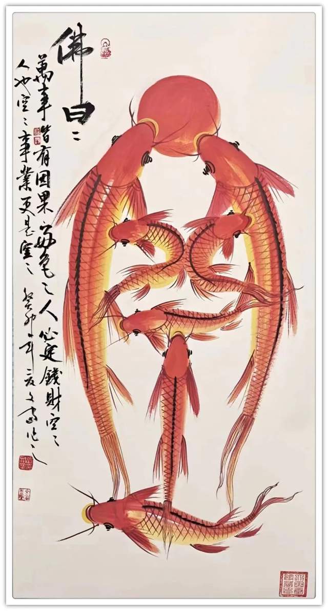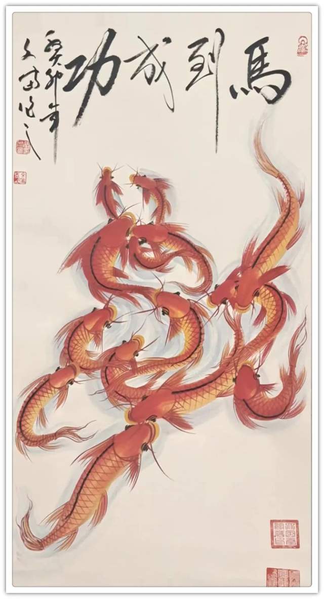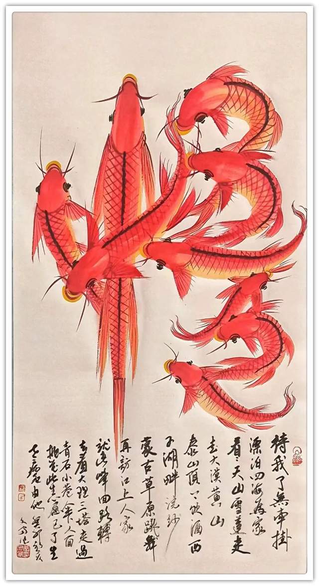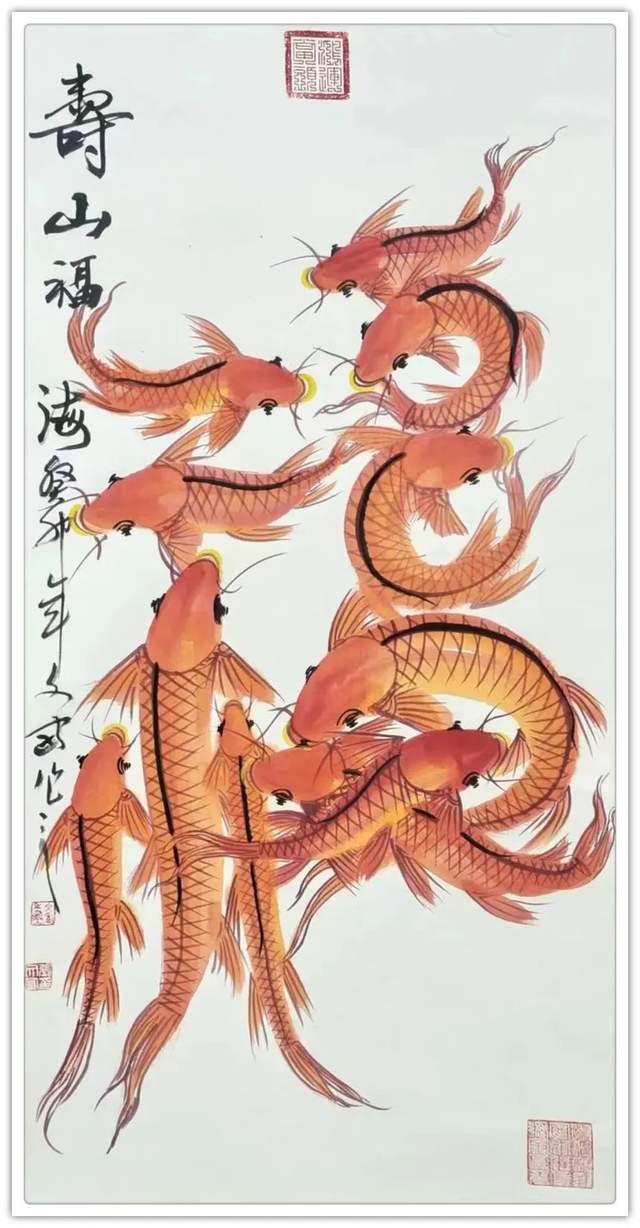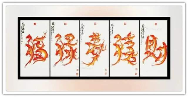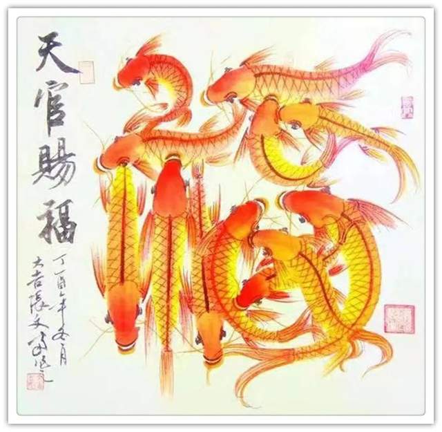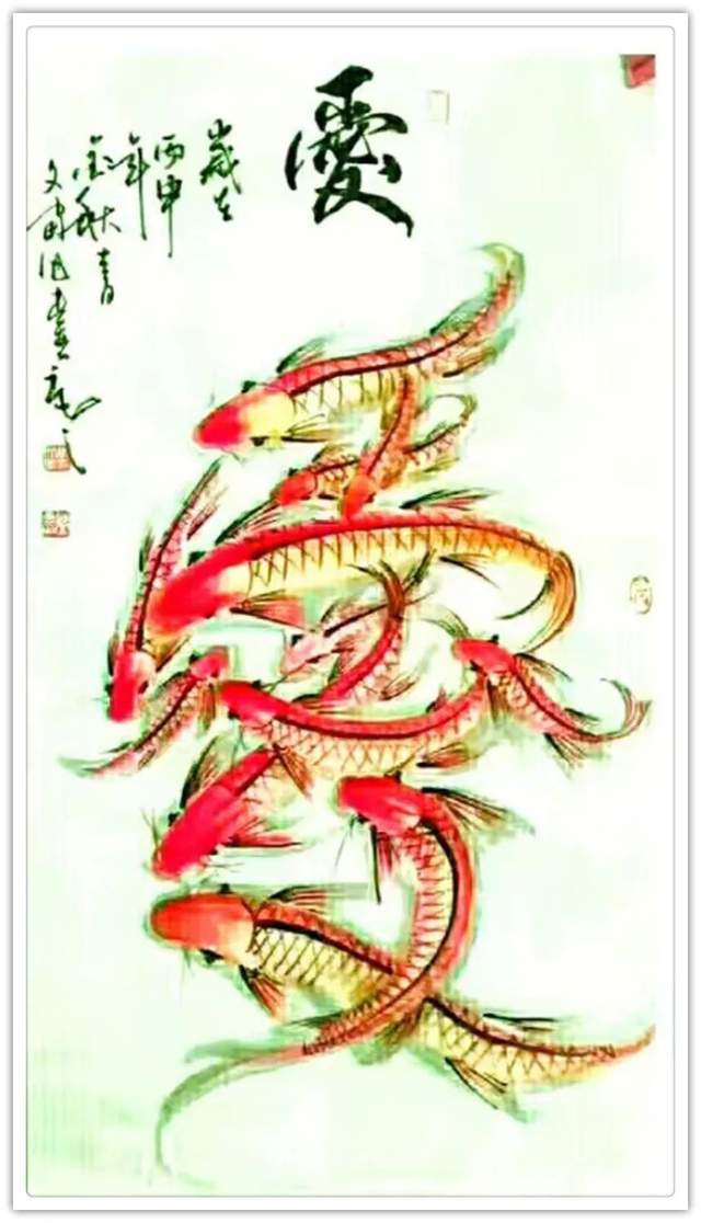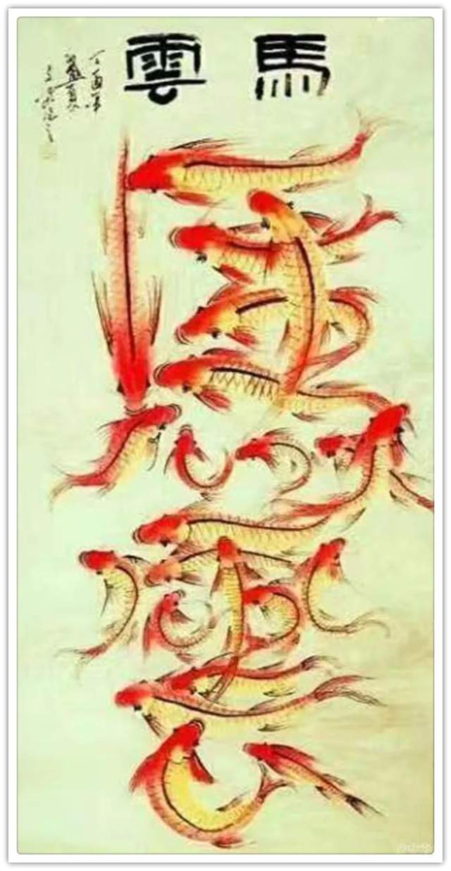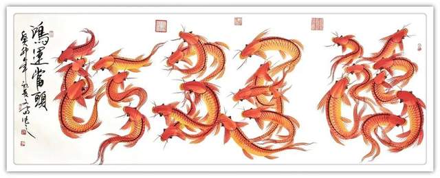 鱼形字寓意就是字中有画画中有鱼,字中有书法,画中有字。张文富先生的创意,就是把中国的书法融入到绘画当中,把绘画也同时融入到书法当中,书画同源,融会贯通,既有篆书,又有行书,还有草书等。鱼在水中游水是主财运的,旺财的,那么鱼往一起聚,它有聚财生旺之意,挂在家里,寓意小日子过的红红火火,鸿运当头;挂在孩子的书房里,寓意孩子的学业蒸蒸日上,金榜题名之意;挂在公司里,寓意事业做的风生水起,再创辉煌,也是鸿运当头之意。居家挂一幅国画鲤鱼图,展现了自身优雅的品味,也能起到调节气场,旺运势的作品,同时收藏价值极高,您值得考虑。