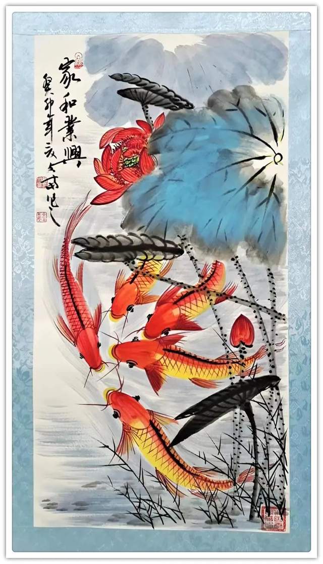 荷花是君子之花,生于淤泥不染污,纯洁绽放,寓意着不与世俗同流合污的高尚品行。红色的鲤鱼有旺财的好兆头,鲤同音利,暗示招财聚财。九条鲤鱼在水中游来游去祝愿主人生意活如流水、长长久久。张文富先生笔下的鱼儿肥硕灵动,形态逼真,旁边的荷花绿意盎然尽情绽放,画面和谐美好。鲤鱼与荷花经典组合,和和美美、连年有余的寓意,表达了人们对美好生活的祝愿。这幅国画鲤鱼图作为室内装饰画,可以调节气场、美化环境,相当受欢迎。