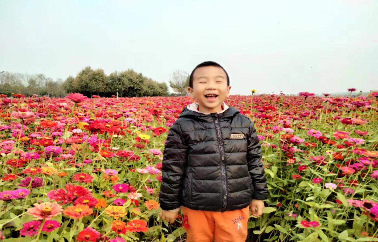 儿子从“城市轨道”一路向东蹦跳如兔,忽而左、忽而右,与花儿相映成趣,问这问那似鸟儿叽喳不停。新城大街东百米处是一片花的海洋,有硫华菊、波斯菊、百日草等,色彩斑斓,美不胜收。