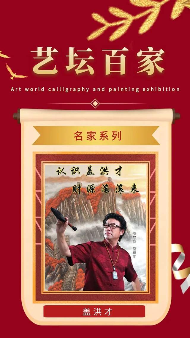 盖洪才勤奋好学。以水墨人物兼长,尤善画虎,专攻山水彩墨画,画出的风水画得周易之玄妙,聚天地之精华,人文典雅,大气磅礴。他书画兼通,其书法善为榜文,意势纵横,具有赵体之影,又有二王其形。题匾书联无数,为人称道。练就倒书丶倒画丶口笔签名三绝,盖洪才做画追求整体和谐,兼工带写,有一种用自然笔触与墨趣结合,营造天人合一之美。用求实主义和现代主义手法相结合,立足当代,根植传统,感知自然,将传统人文精神带入生活,让作品进入寻常百姓家。营造山性即我性,山情即我情,人物传神,气韵生动。他十余年潜心于艺,以无与伦比的坚韧及深厚的艺术功力,与挚友王惠完成了六十六米工笔长卷《中华神韵图》及五十米长卷《蟠桃盛宴图》震惊中外画坛!著名美术评论家徐恩存先生,概括的说:“笔墨创新,自成一家,堪称扛鼎之作。结合高科技做画,是国内首个发证利未科技能量书画执行官,他用书画服务社会,在善举活动中,曾评为“中华骄子”“新时代先锋者”“北京诚信大使”,“爱心文化使者”“新奇绝达人"“爱心大使”等多个荣誉称号。