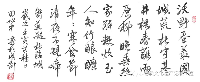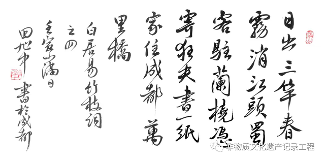 重要创作有草书作品《毛泽东诗词草书长卷(83米),《红军长征歌》(26米),《田旭中自作草书诗卷》(30米),《蜀山赋》(20米)等。先后筹划并主持《世纪天府百年绘画》《天府百年美术文献展》等大型艺术创作话动。担任《天府百年美术文献集》《天府名家联袂创作毛泽东诗词草书长卷》等典籍主编。