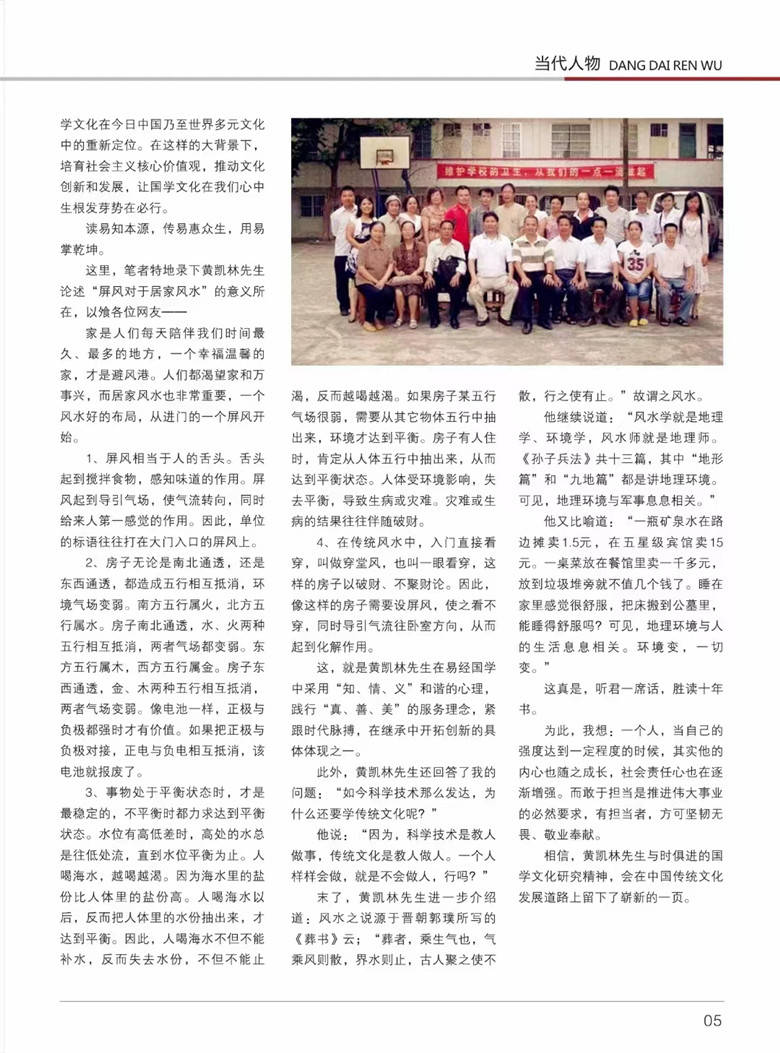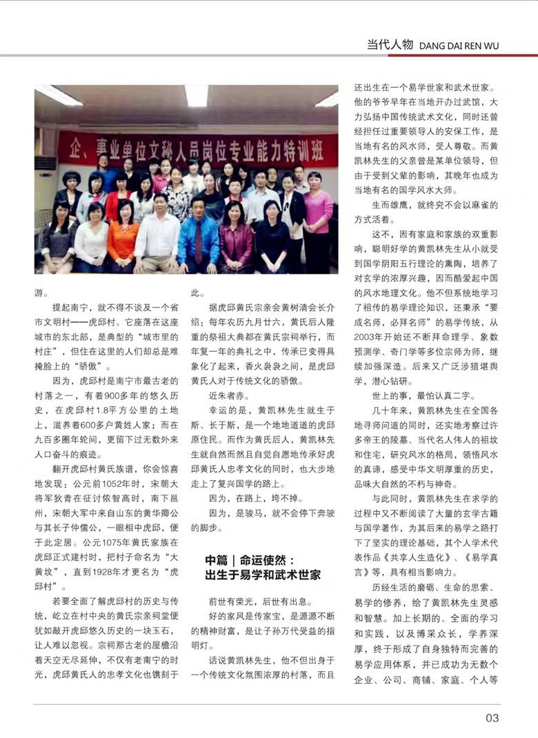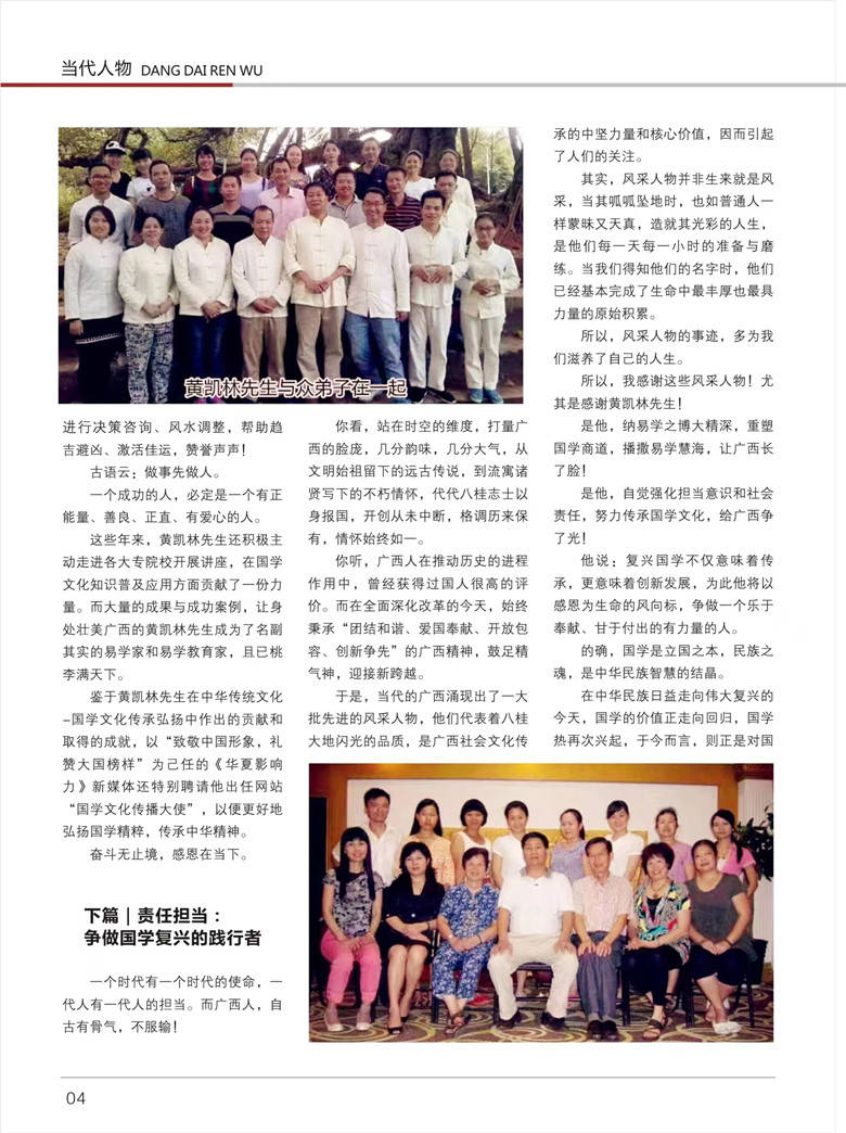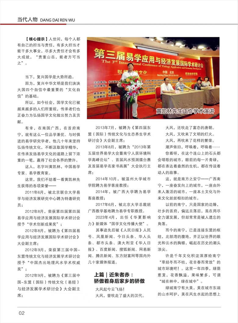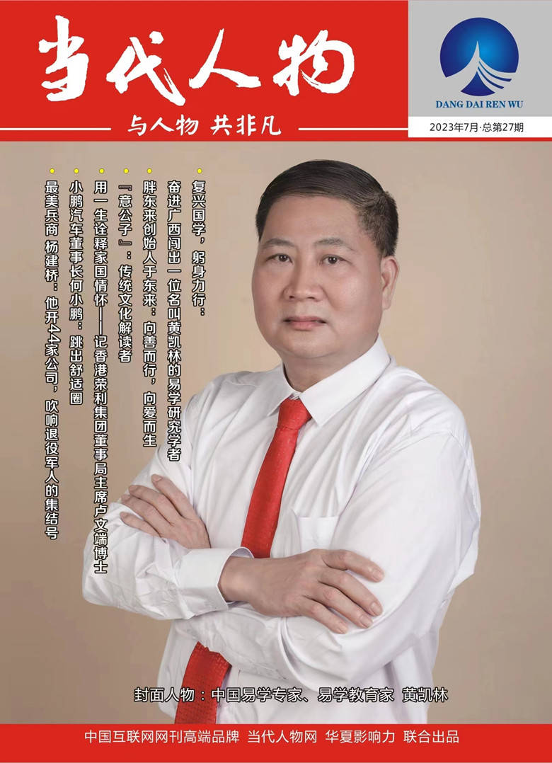 为了更好地弘扬中国传统国学精髓,肩负起易学传承大旗,进一步建立我们自己的文化自信,《当代人物》杂志特别遴选黄凯林先生为2023年第7期封面新闻人物,杂志内页还专门配发了长篇事迹报道——《复兴国学,躬身力行:奋进广西闯出一位名叫黄凯林的易学研究学者》,以期树立榜样力量,引领前行方向。