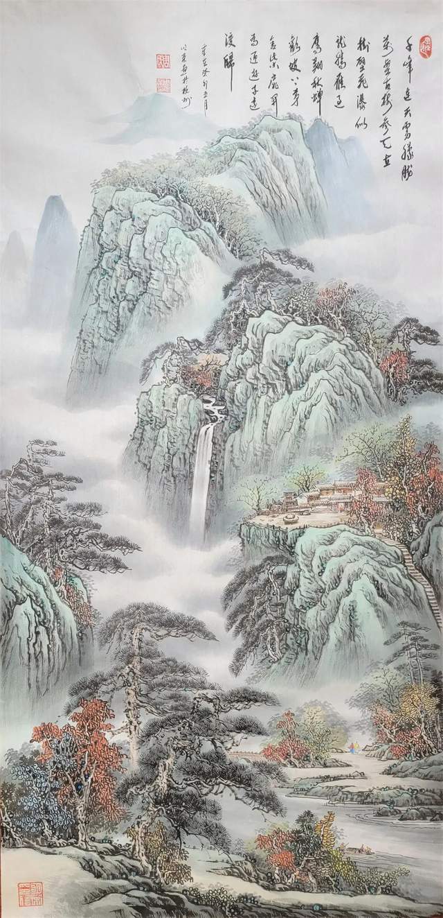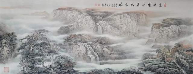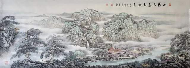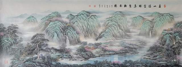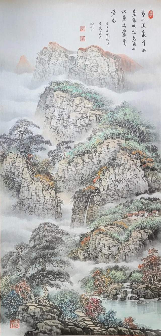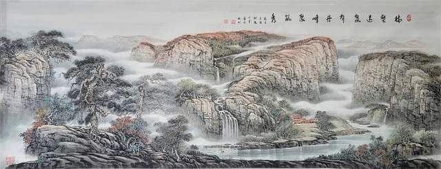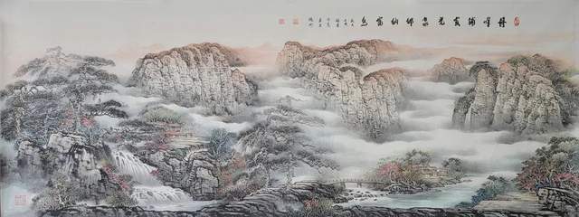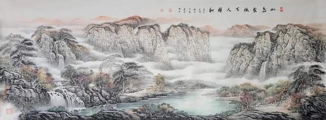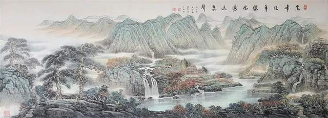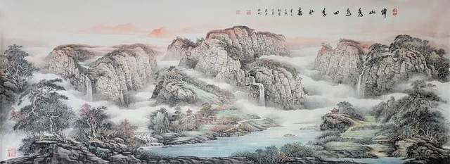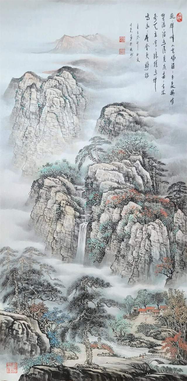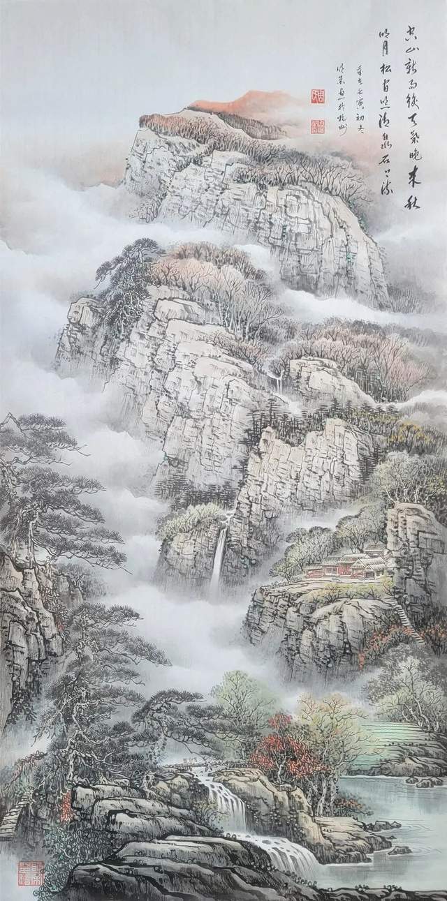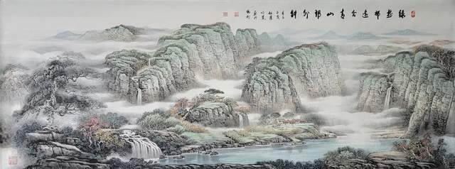 周明荣先生画山水,无意引领时代画风,但是画风灵动,无意留功名,功名已然得。画坛领导者,功在技法严谨赋彩秀丽,他用清新洗练的笔墨写意山水的气韵生动,在深师宋元的基础上,不遗余力地弘扬文人山水的诗情画意。醉在畅神,制韵显妙!他的山水精工细腻,但不失骨力,融有吴门丹青的力感精神,山峦追云,丘壑空远,既立山水之骨,也传山水之神,体貌与气韵具得,韵和势相和,把北宗山水的苍茫壮丽与南派山水的色润华滋融为一体,其中所涵养的情感,非小文人的清寂,而是大文人的宏阔!
