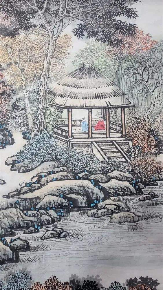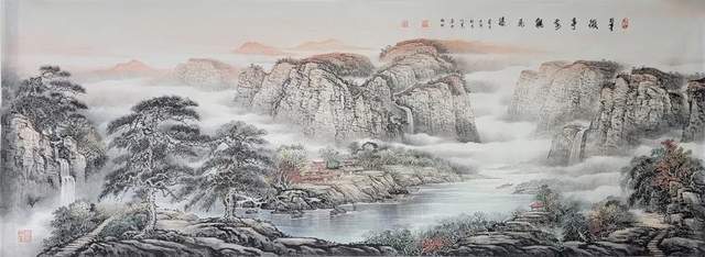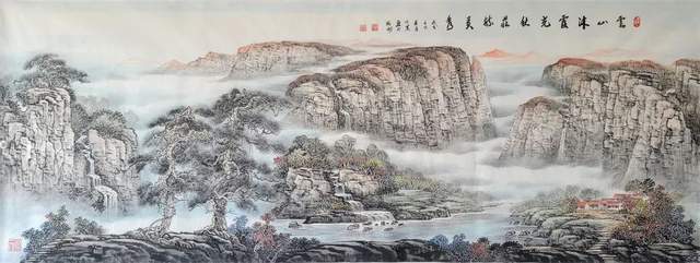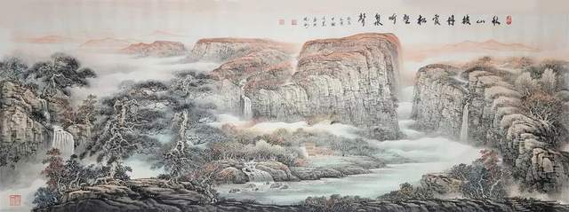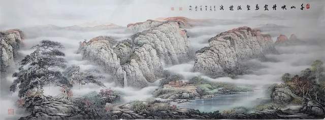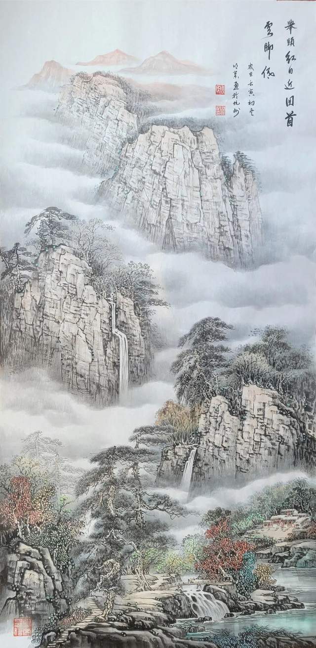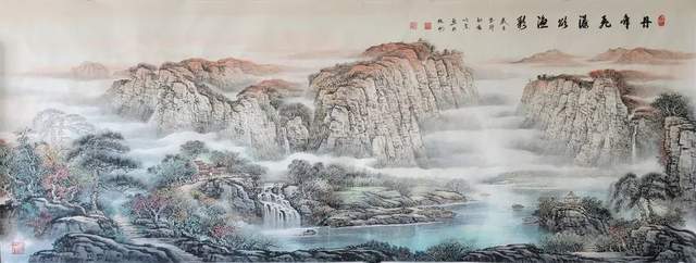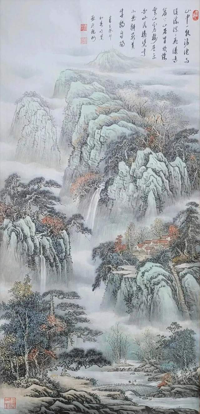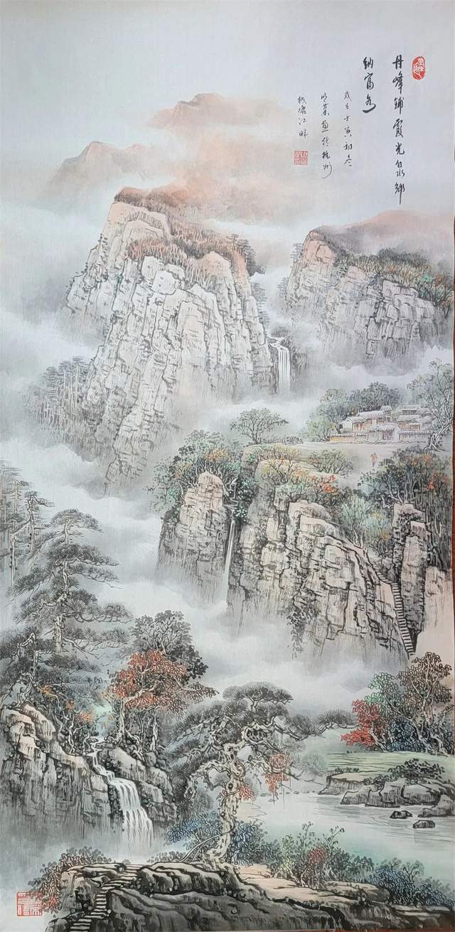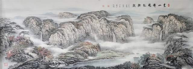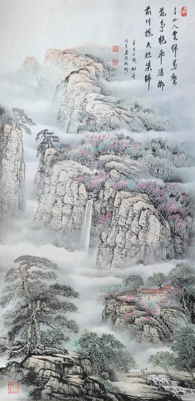 周明荣先生画山水,无意引领时代画风,但是画风灵动,无意留功名,功名已然得。画坛领导者,功在技法严谨赋彩秀丽,他用清新洗练的笔墨写意山水的气韵生动,在深师宋元的基础上,不遗余力地弘扬文人山水的诗情画意。醉在畅神,制韵显妙!他的山水精工细腻,但不失骨力,融有吴门丹青的力感精神,山峦追云,丘壑空远,既立山水之骨,也传山水之神,体貌与气韵具得,韵和势相和,把北宗山水的苍茫壮丽与南派山水的色润华滋融为一体,其中所涵养的情感,非小文人的清寂,而是大文人的宏阔!