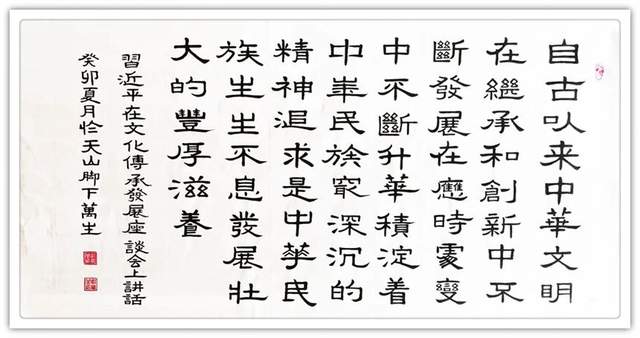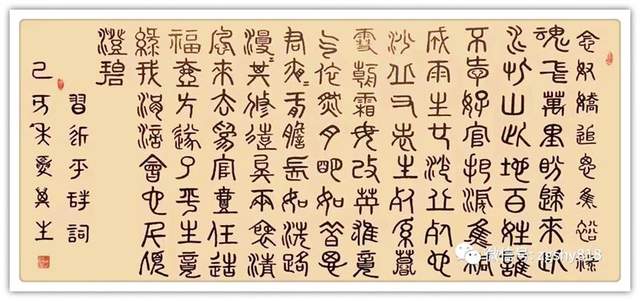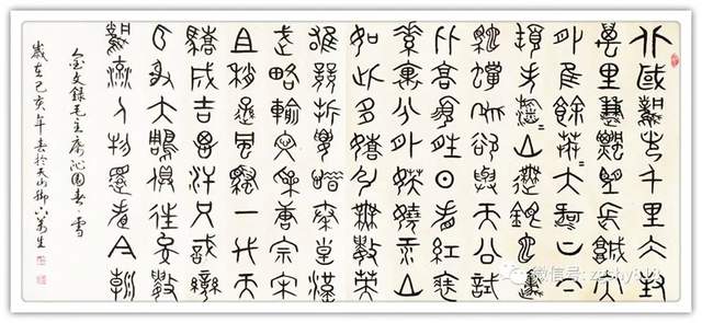 先生磨砺书法诸法皆成,博涉多优。笔势论有言,穷研篆籀,功省且易成。郑先生深追书法的起与源,写金石朴茂,作秦篆铁笔,刚柔相济,使转圆活,篆籀法度精益求精,是一位通过篆书磨砺而得笔法正宗的大手笔。依秦风入汉韵,写透汉隶十碑的丰姿多神,把曹全碑的雅与张迁碑的古合为一体,一波三折作古雅,蚕头燕尾写萧韵,强化了隶书的书写生,左掠右挑尽显笔墨要妙。