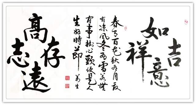 行草之法需要两力加持,一是要严谨的洁度,一是需要炸墨的自如。唯有法度是书奴,唯有自好是粗糙。观先生的行草作品,远师张芒杜度,后师张旭怀素,亦吸呐王铎执笔如剑的精气神,移师诸圣融会贯通,成为写透传统行草法度的能豪,绝无草书不入格,神仙不认得的尴尬,可见文人书法基于法度,放手写心的天质洒脱。一笔拉过来,如闲云追月,一笔纵过去是鸿飞兽骇,通过提摁顿挫的组公与变化,把行草线条写得类万物之象!在锋须往来之际,既写铁点银钩,也写刚柔相济,重若崩云,轻如禅翼,笔墨变化万千,正是一划之内变起伏于锋梢,一点之内殊衂挫于毫芒的翰墨经典!