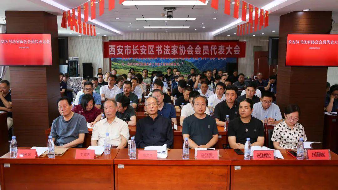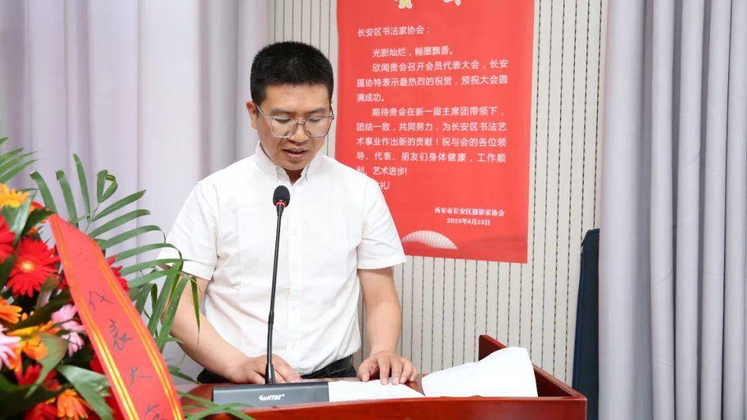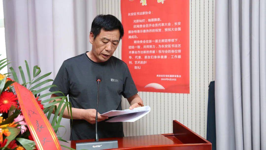 会议由陕西新闻广播资深主持人银河主持。区民政局副局长高亚慧、区文联组联部主任刘超分别宣读了同意换届的批复文件。长安作家协会主席张军峰代表兄弟协会致贺词。王江代表上届书协做工作报告、郭战备做财务工作报告。大会审议通过了《西安市长安区书法家协会章程(草案)》《西安市长安区书法家协会会费收取办法》《西安市长安区书法家协会理事会、监事会选举办法》等内部管理制度。