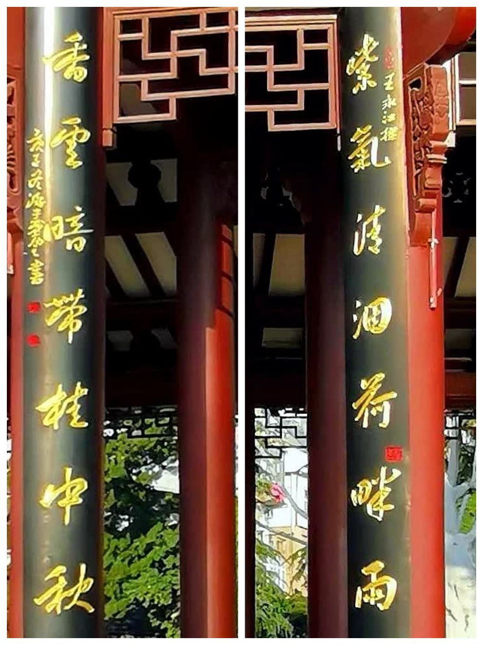 来到公园大门口,你就被两边门柱上的一副对联吸引住了: