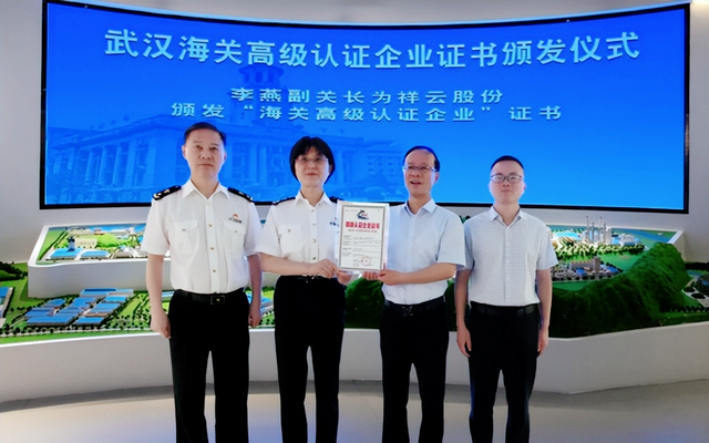 6月27日上午,武汉海关高级认证企业证书颁发仪式,在湖北祥云(集团)化工股份有限公司企业文化展厅举行。武汉海关副关长李燕(左二)向祥云股份党委书记、董事长胡华文(右二)颁发了“海关高级认证企业”证书,黄石海关关长彭成(左一)、武穴市政协副主席张颖(右一)共同见证了这一荣光时刻。黄冈市商务局副局长陈旭、武穴市商务局党组书记郭国斌,以及祥云股份领导蔡志汝、姚勇等参加活动。