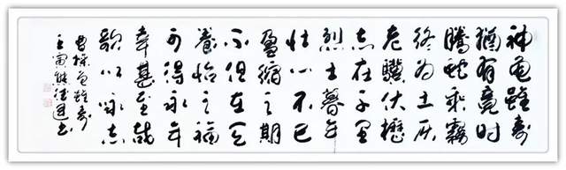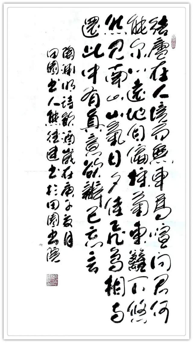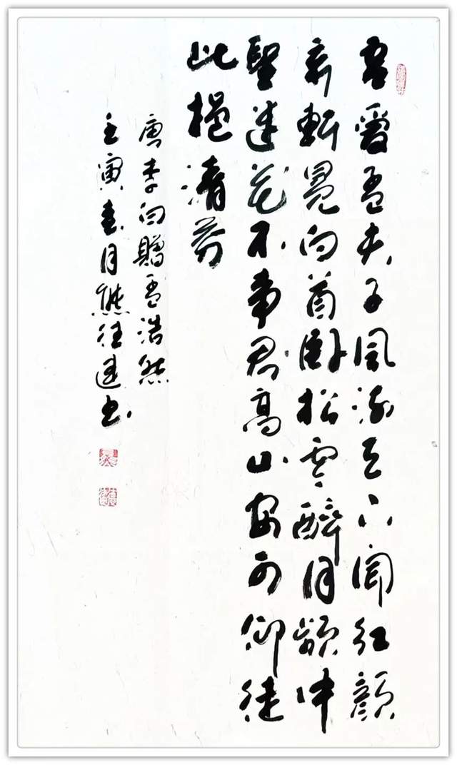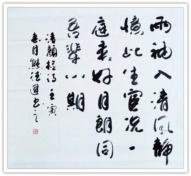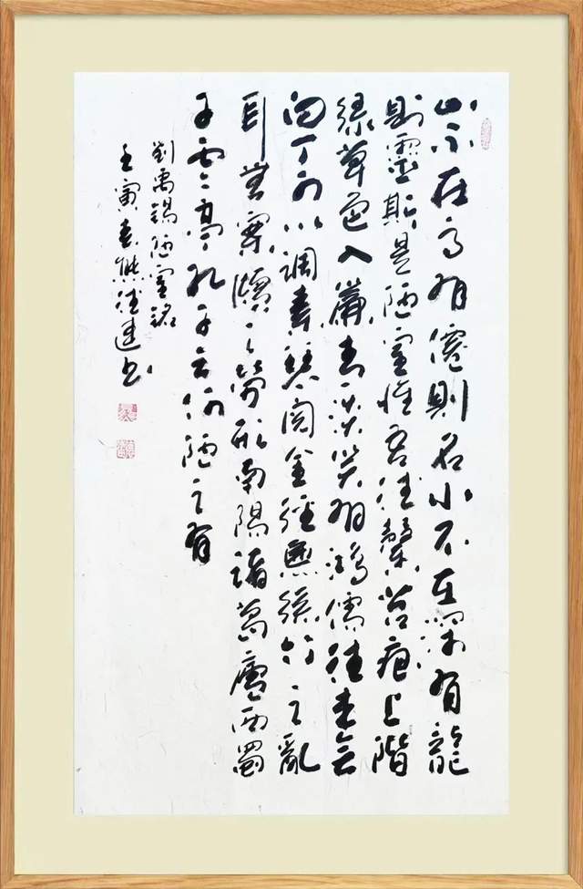 再者,他书法里文人书法的洒脱气质,是来源于“无法胜有法”的表现。他有很强的法度功夫,但是书法写到要妙处,会把功夫隐藏起来。不是不使功夫,而是让功夫退其次成其基,把功夫的“硬度”当成底子,主体展示气质的生动洒脱。这就如一位修武修德,功达三山巅的圣者一样洒脱,不显粗陋,绝圣弃智!一切无法,心入笔墨,洒脱的气质就飘逸而生,令人感觉有约花分柳的飞动,也风来过雨来过的自然。