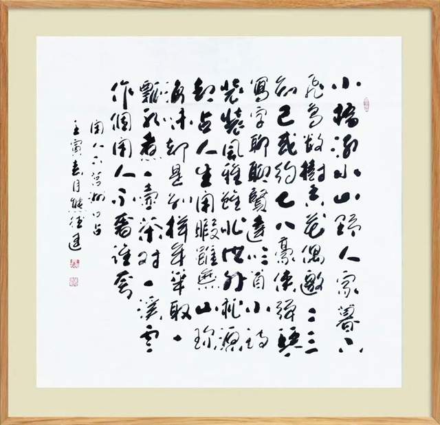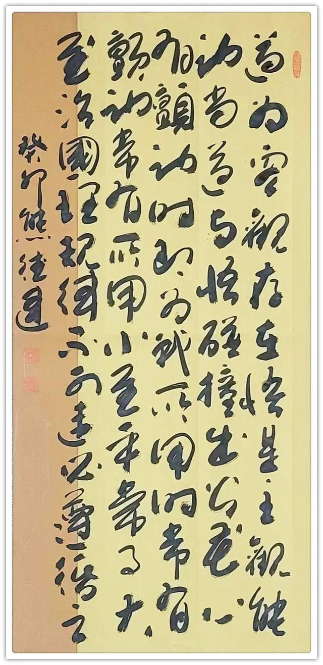 为什么说他的书法有圆融的文化品质呢?因为他在创作书法时,会主动让书法与传统哲学精神进行和谐对接,起笔落笔都写得不激不厉,火气很重的笔意没有,使转自如,天质自然。执笔于手,可以用道的智慧写玄机,太极笔意,让线条因圆而融,墨韵因融而圆,越看越有滋味。滋味看到深处,脱口而论:人法地,地法天,天法道,道法自然!