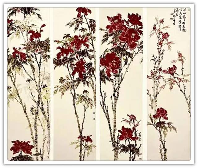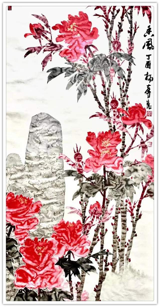 经过长久而精心的传统笔墨功夫历练,杨育才掌握着娴熟的中国画真功夫。然而他创作出来的牡丹作品又与那么范式的、约定的、同质的牡丹作品大有不同,有着木秀于林的姿态!这是因为他在传续传统画法的同时,又作出了笔墨当随时代的创新塑造,深度挖掘渍色牡丹的创作机理,通过渍色渲染把牡丹画出风展辉煌的新形态!一件《牡丹四屏》作品,依形神兼备尤贵于神的姿态美展现渍色奇观,即是美学创新的标本,也是中国画审美的激变经典!色彩经过水渍,层次分明,艳丽却不艳俗!渍去了所有的甜俗流弊,激变成了富贵牡丹如风旗,可为大国显镜像的文化载体。大国崛起文化复兴,杨育才先生的渍色牡丹,既有十万大山的形态张力,也有万众一心的精神导向,笔墨当随时代的丹青功勋,水到渠成!