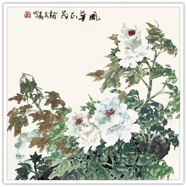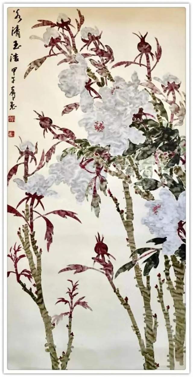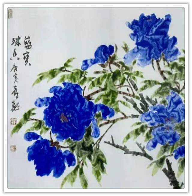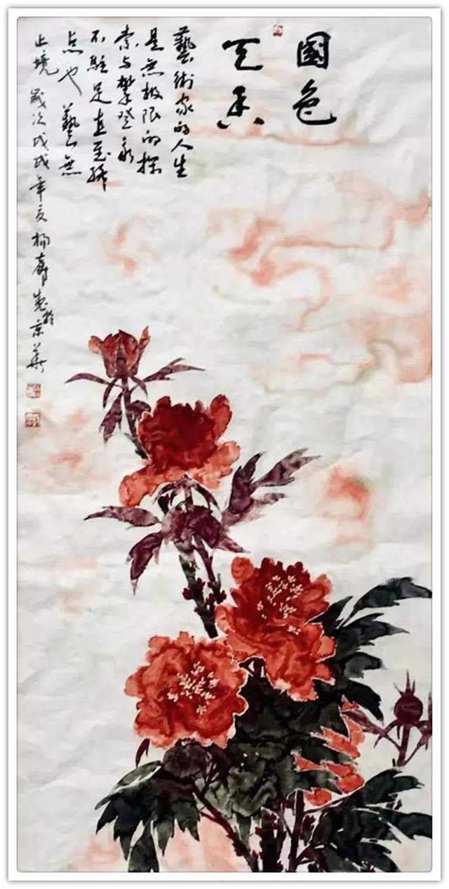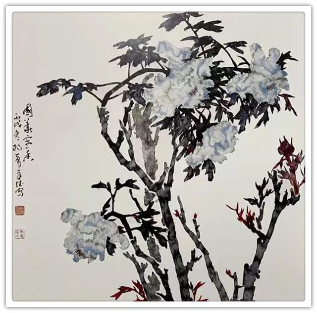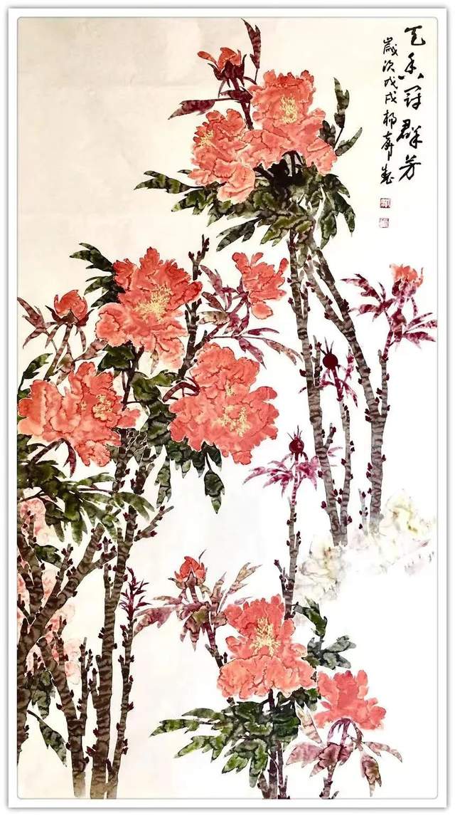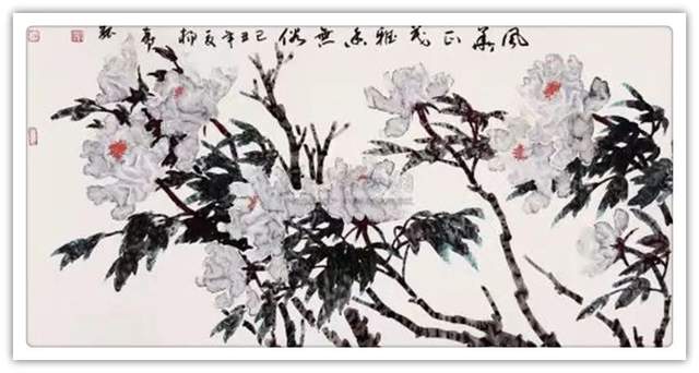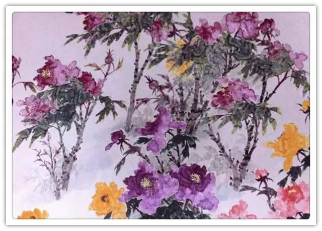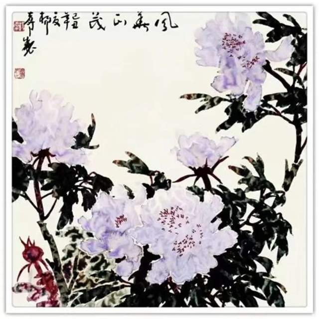 他三十五年如一日与牡丹相伴,解其华骨,构思贵魂,独创渍色牡丹。其专从骨入枝,从神建蕊,以渍色状花魂,或枝瘦花肥,或花润枝沧,清香袅袅、意境深远。