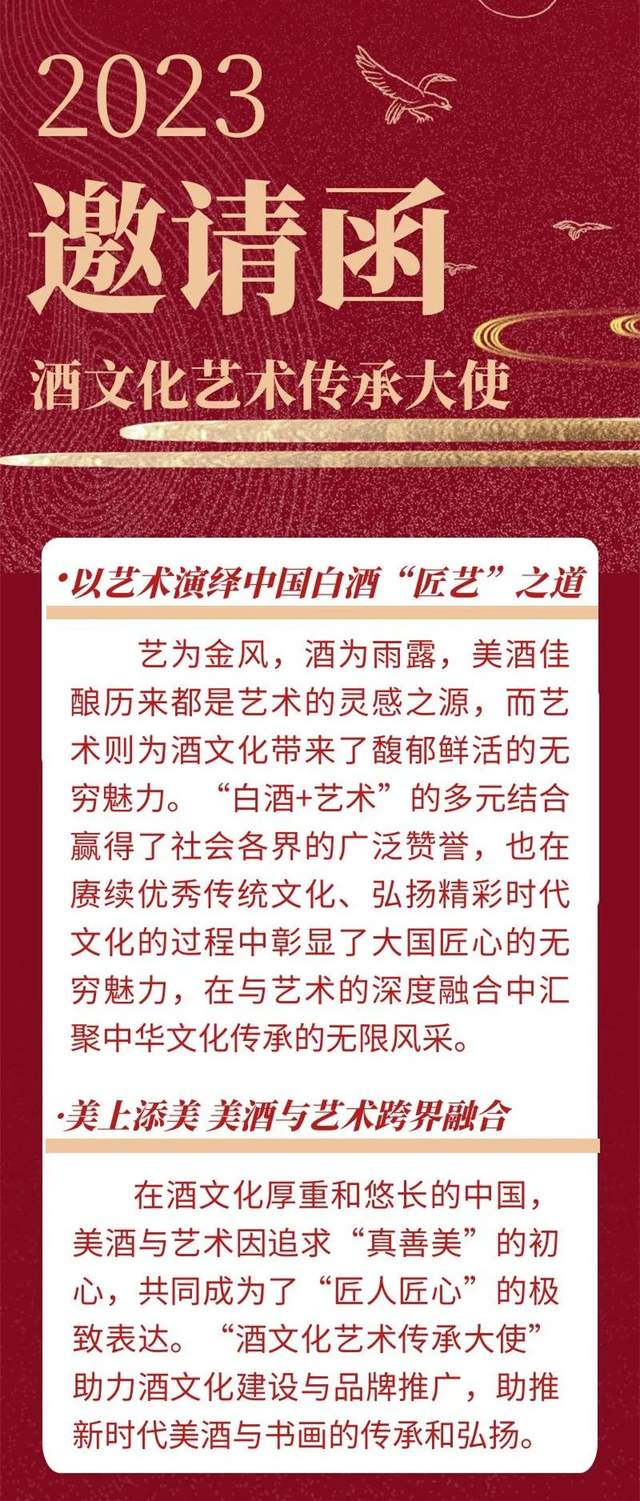 “酒文化艺术传承大使”将中国传统书画文化与酒文化相互融合,旨在通过中国文化酒的传播,从而铸就高品位生活,传递社会正能量,让艺术真正走近人民。它不仅是一款酒与文化的完美集合,也是文化的传承,更是酒文化的一种诠释。