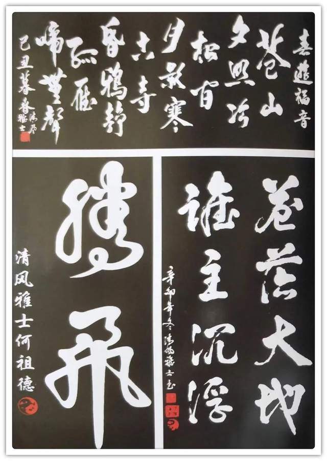 从书法的习成宽度来观察,何祖德书法历练博涉多优,诸书皆成。上下非齐平,左右非方整,绝无算子之状,皆是丰神多姿的灵动气象。以楷书作根基,令何祖德先生的书法根子特别扎实,起笔落笔都可以表现书法创作的非凡实力。