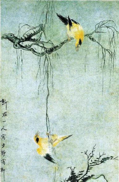 两个黄鹂鸣翠柳。《黄鹂垂柳图》(局部),清代画家华嵒作。