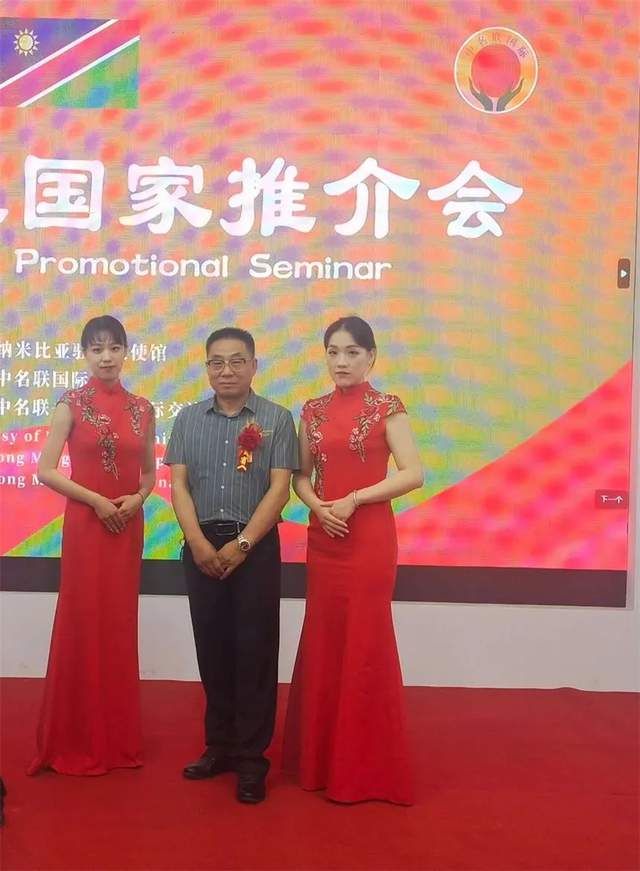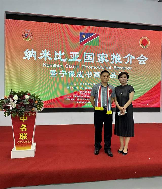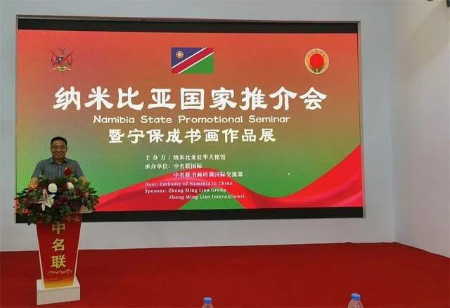 宁保成发言说,我应邀在纳米比亚国家推介会上举办我的书画作品展,心情非常激动!中名联站在历史的节点上,坚决贯彻领袖的指示精神,努力把中国文化推向国际走向世界,让世界各国人民更多认识、了解中国文化,把中国文化传播到世界各地。中名联在戴本领先生的带领下,独创了文化艺术和国际贸易的结合,文化和地方旅游的结合,文化和地方文化产业、企业经营的结合,在当代经济市场中,把中国文化注入到国内外企业,向世界贡献中国文化、中国精神、中国艺术、中国智慧。作为一名书画家,能为两国文化艺术交流作一份贡献与探索,倍感荣幸,同时也为和中名联甘当中国文化国际传播桥梁倍感荣耀。