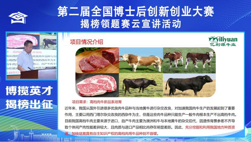 本次公司宣讲的项目是《高档肉牛新品系培育》, 目前我国高档牛肉主要来源于进口,自产牛肉主要为澳洲和牛与本地黄牛的杂交后代,因遗传背景参差不齐导致个体间产肉性能差异较大,且肉质与进口产品相比尚存在明显差距。因此,充分挖掘和利用我国地方种质资源,加快培育具有自主知识产权的高档肉用牛品种刻不容缓。山东地方牛品种资源优势明显,是渤海黑牛的起源地,同时也是鲁西黄牛的主产区。渤海黑牛具有肉质好、耐粗饲和抗病性强等优良特征,尤其是其独特的雪花状大理石花纹肉深受国内外市场青睐,是高档牛肉生产以及新品系培育的优质资源。