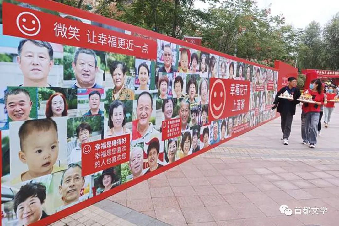 街边上,还展开一幅巨型的笑脸墙,上面满是一张张开心欢笑的照片,有男有女,有老有少,笑脸相迎四面八方客。中间穿插着一条条朴实而可爱的标语:“微笑,让幸福更近一点。”“幸福是您喜欢的人也喜欢您!”“幸福花开上流家”……