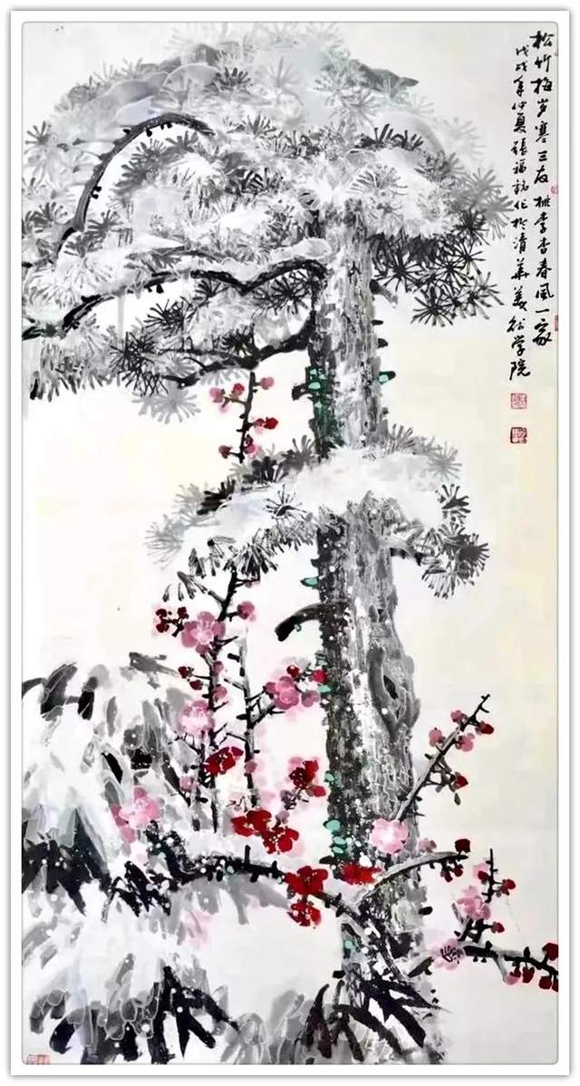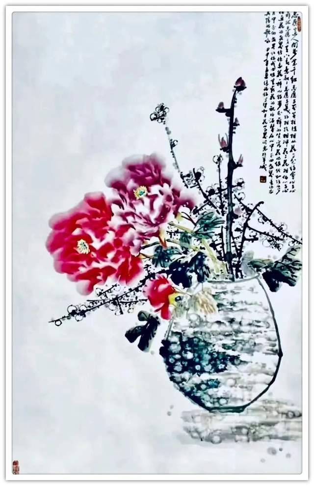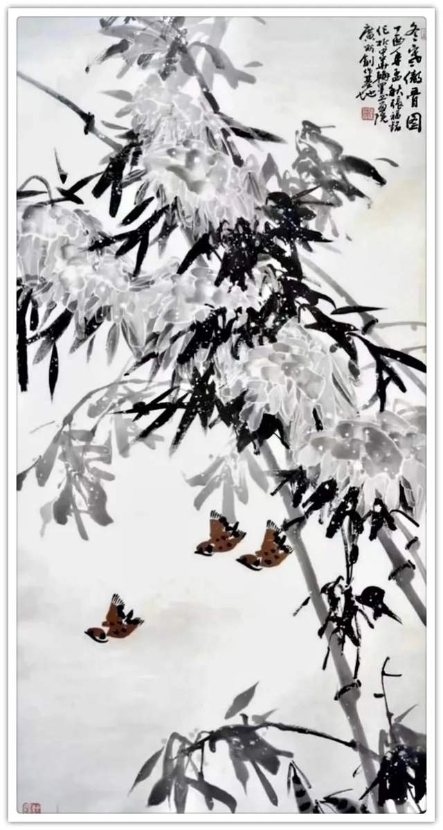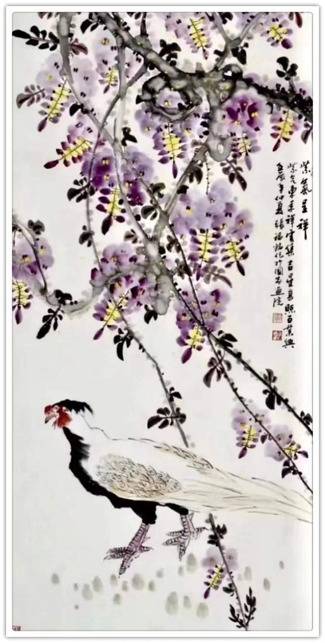 同样,他画其他花鸟作品也是文武兼备的证见!笔墨铿锵写意富贵牡丹,非仅富贵也!最有雄迈品!铁笔塑铁筋,雄墨写雄魂,骨法用笔,应物象形!再经过随类赋彩,就把牡丹画得既有君子之修,也有侠者之勇!他的画法刚则万分刚猛,雄则百倍雄强,给观赏者塑造起一个可以感受震撼力的艺术空间。在这个空间里游目骋怀,必然会心感铮铮!浓墨重彩,浑厚华滋,无限的审美张力,令他成为画坛的铁流派。唯有在军中得到身心熔锻,方得笔墨如此峥嵘!