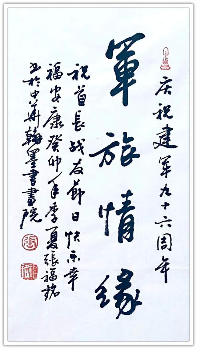 先生的书画艺术历练出非凡的影响力,与他历练人生同工异曲!参军二十六载,早生华发修武备、笔作长枪文载道!他心有军旅情怀,情有报国之志,所作丹青形神兼备,尤贵于神。以铁胆雄魂写寒竹,风萧萧,劲节凌冰,刚且韧,劲且强!成为一题专享的艺术课题。竹圣郑板桥没有这样画过,张福铭把自己在军营历练的所有感受与积淀画成了筋骨劲竹,亘古未有。竹作人格化,画写精气神,独树一帜,大振心颜!军营励志,丹青写魂。这就是张福铭先生文武兼备涵养出的独特创造力!