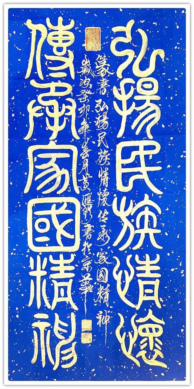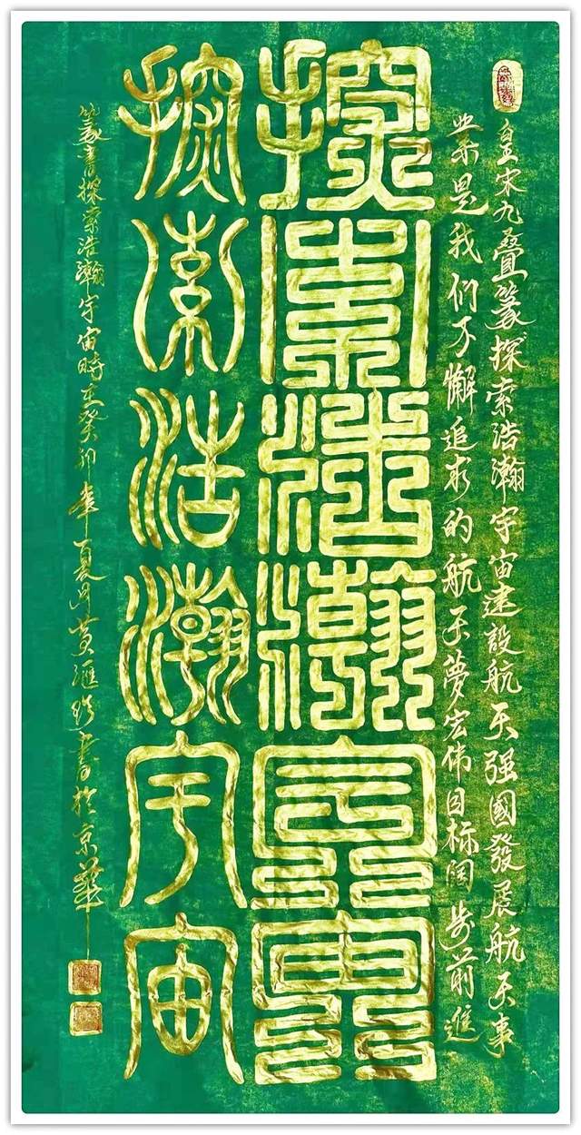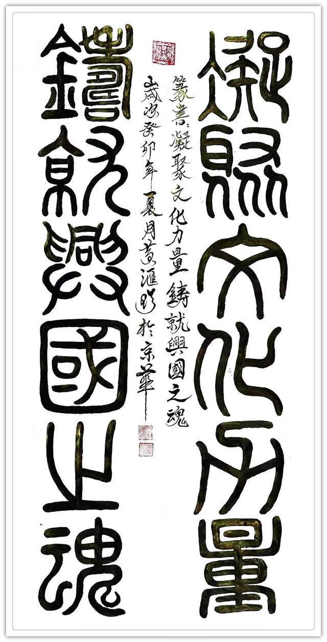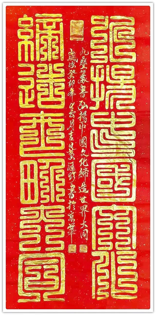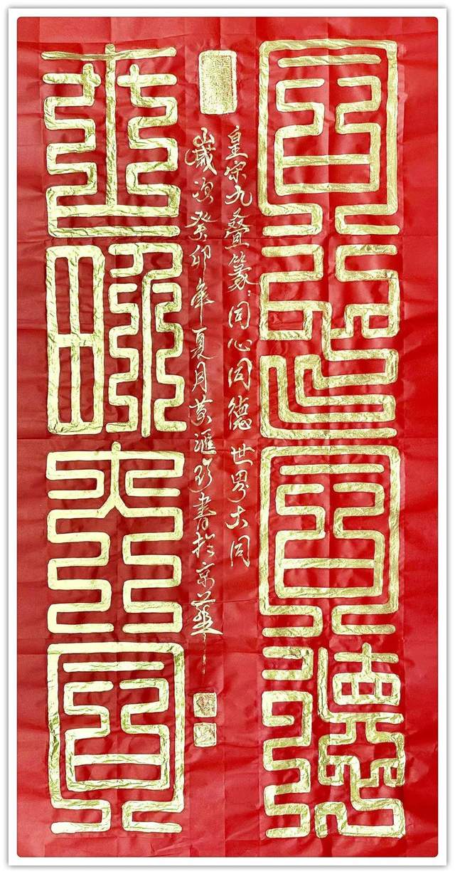 名家评论:寿山石雕刻、篆刻国际工艺美术大师;国宾礼艺术家黄汇珍书法最新创作数百余幅精美的鸟虫篆、龙篆文、龙爪篆、金篆等书法作品,字体用笔豪放质朴,醇厚圆润,变化奇异,壮美多姿,书体苍劲飘逸,飞动瑰异,在纸上写出来它的神采风韵,散发着原始社会的瑰丽色彩和神秘精神。各大媒体被这种神秘而美丽的文字而吸引,仿佛穿越了时空,看到神奇而绚丽的青铜文明。它标志着我国文字在发展中,从书法结构到书法风格都强调自身艺术价值,高贵而华丽,丰富的想象和深刻的寓意构成的图画美、文字美,给观赏者以美的享受。鸟虫篆是与甲骨文同时代的一种文字,由图腾文、甲骨文、金文演变而来,起源于商周时期。