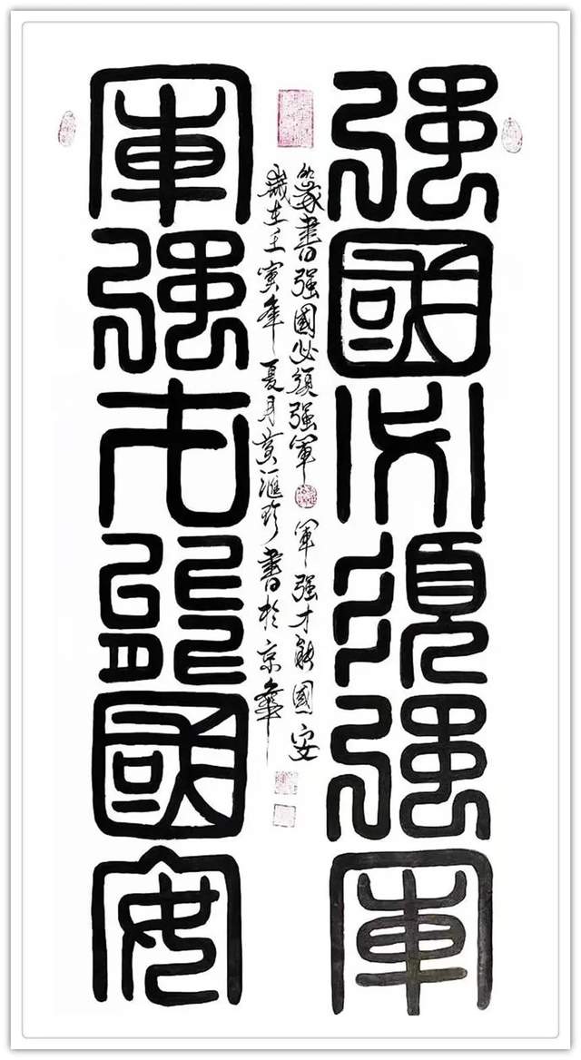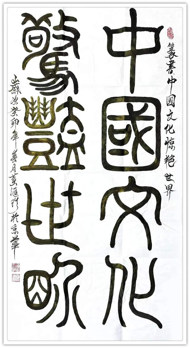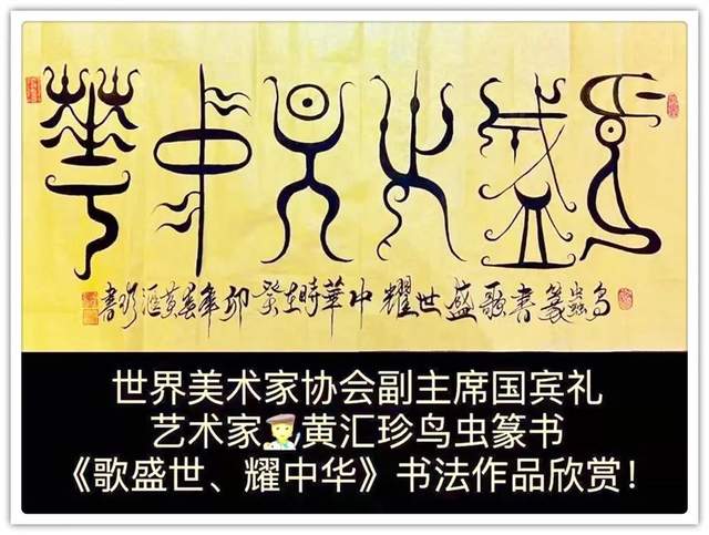 国礼艺术家黄汇珍鸟虫篆作品有三大特点:一、继承古文化,和古人书法相比,他在小篆的行间里适时在笔画上加上鸟首,以美观为宜。二、书写技法的创新,打破了大篆的鸟书结构,每个字以小篆为基础,删去古体羽翼,清秀端庄,易于识别。三、打破以前只做印章篆刻,把鸟虫篆语言文字书写成作品,不断参加书法大赛和展出,让人们广泛观赏研讨、交流指导,在创新中提高书法艺术水平不断提升自己的书写✍️能力。现在她写的鸟虫篆书风格自成一体(每个字体用雙鸟头表现,体现宇宙规律,阴阳对衬,体现出祖先老子道家内涵)。字体潇洒柔和,字中有画,画中有字,并且含有象形字的文化元素,情趣有加,受到国内外文化界好评和广大收藏爱好者的喜爱。国礼艺术家黄汇珍鸟虫篆书、龙篆、龙爪篆、金文以及篆书书法作品大部分都是作为国礼赠送给各大使馆以及有关机构企业家们收藏。