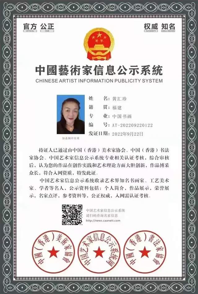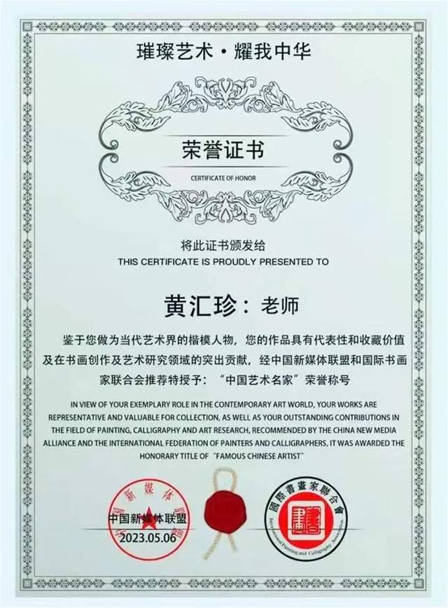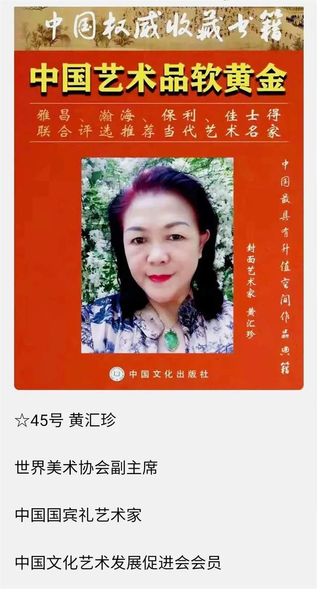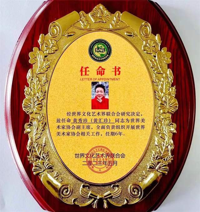 世界文联文化艺术界联合会;世界美术家协会副主席;国宾礼艺术家黄汇珍《字秀珍》现为:《国际职业规划鉴定中心:国际工艺美术大师》