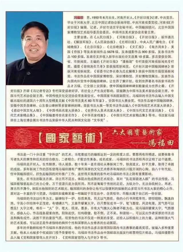《开封日报》开辟《冯记者专访》专栏深受读者好评,在社会上产生良好影响。现被聘为中国书法美术家协会副主席,中国当代艺术协会副主席,中国国家书画院副院长。