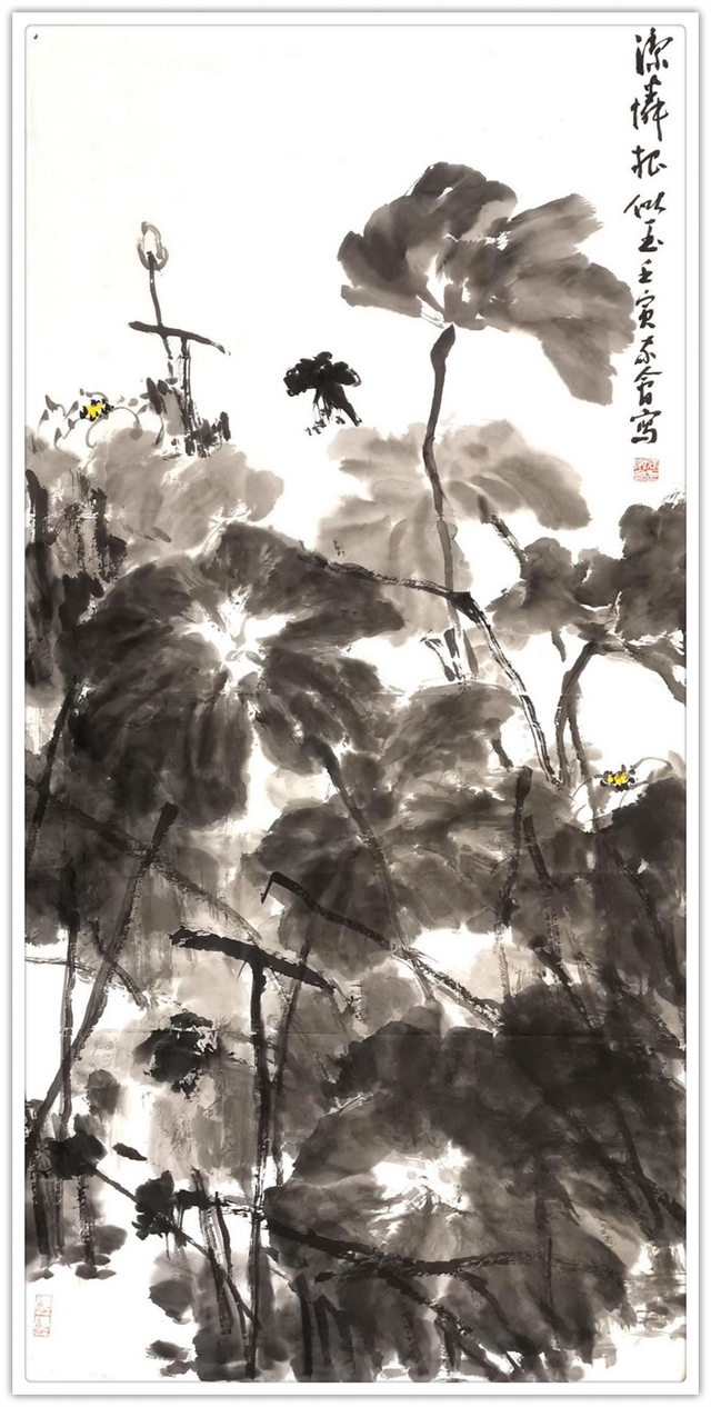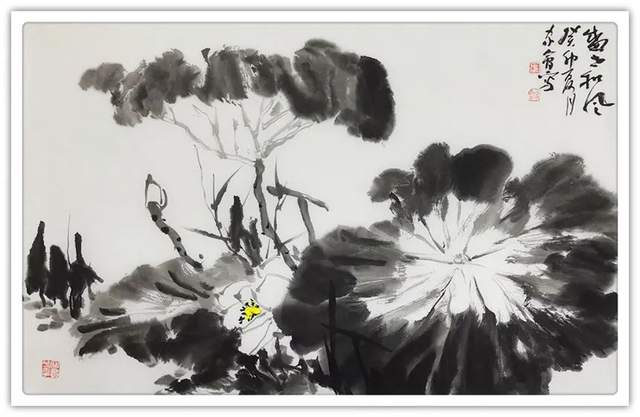 张家会的荷花,多见秋荷、残荷。他笔墨洒脱,浓淡相宜,繁杂中蕴含章法,墨色里饱含韵律。所画残荷,枯枝清奇,败叶曼妙,错落有致,一种凄寂之美,阐释出文人清高淡雅;秋荷,落墨淡然,如云似雾,叶片交合,繁复中蕴含空灵,水墨交织间尽显清秋之美。荷间,往往有几只水鸟,或引颈高歌、或俯首觅食、或信游水面,寥寥数笔,姿态各异,使画面顿生灵动之感,为荷的禅意,注入了文人孤高、典雅、纯洁的情致。