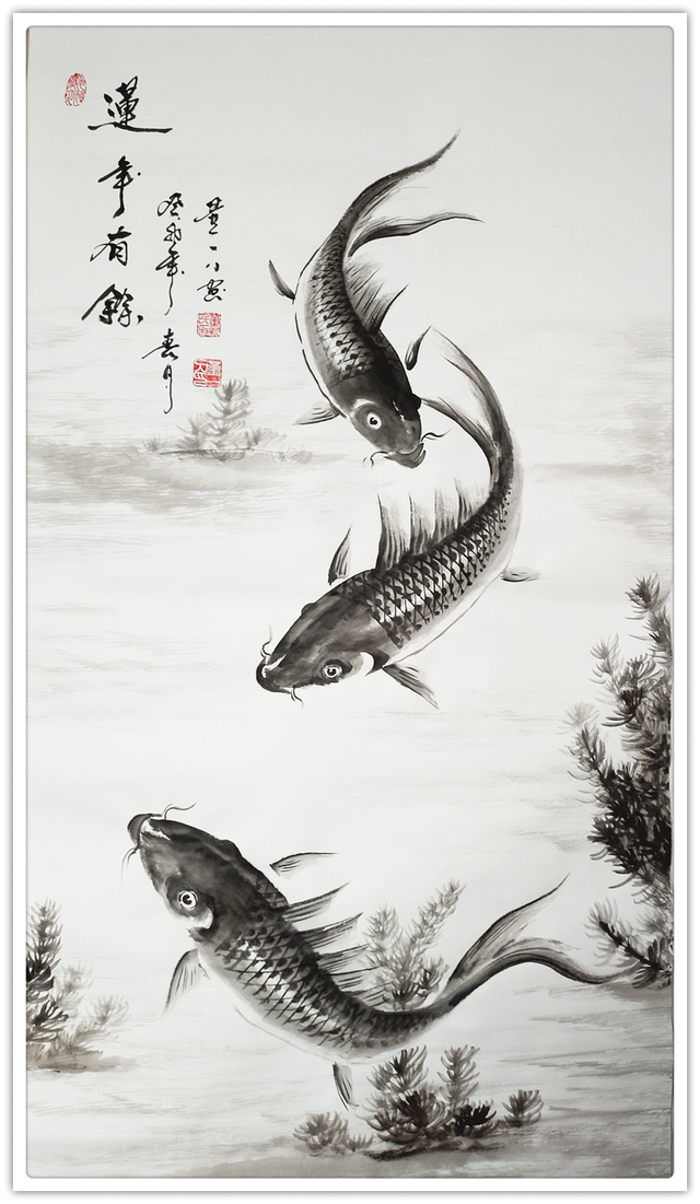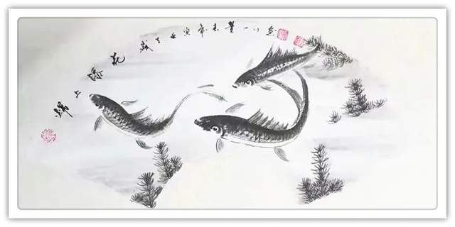 他作丹青,能够兼工带写,可以夺物象之精神,能够掠物象之体貌。笔笔相生作鱼图,笔笔相映谙道学。红内财,黑外财,有无相生,虚实相映,这既是年年有余的吉祥图,也是运化风水的道之图。这样的作品挂在家居,当然有吉,当然启运,当然求可得矣,当然心可安也!这就是文化与丹青相结合,可以令人赏心悦目的上上品。唯有像董新民先生这样,既有深厚的传统文化修养,又有娴熟的丹青法度积累,才可以把一幅有余图画得玄机要妙,内涵丰富而无极!