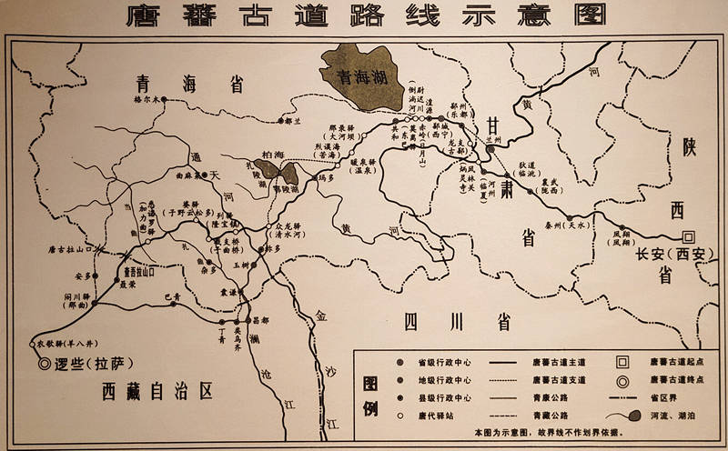 作家、嘎嘉洛文化、源文化学说创建者文扎认为,唐蕃古道分东段和西段。东段指的是从长安到鄯城的路程;西段即从鄯城到逻些的路程。唐蕃古道西段,到柏海(扎陵湖)为止,有较确切的记录。走到牦牛河,就语焉不详。然而,通天河是唐蕃古道上绕不过去的一道天堑。进入玉树境内,有南中北三线通往拉萨。中线称卫藏道。是古代汉藏之间的重要官道,也是安多、康巴等地众多佛教信徒的朝圣之路。当我们看到通天河七渡口南坡上那条被踏成垭口的古道时,就能窥见古道曾经壮观之一斑。北线跨越昆仑山口向西南延伸,古称“蒙古道”。当年文成公主入藏,我们有理由认为取道中线进藏。可以推想,沿途的人们都想跟她沾点关系,套个近乎。只是这种现象留给后人,有的只是传说而已, 有的却留下了一些似是而非的遗迹。