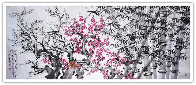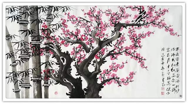 李朝云先生的作品给人一种典雅之感,融心境在其中,追求一种精神上的力量来传达笔墨灵透的精神境界,从而达到形神并至。其笔法精妙独到,注重线条的流畅感,花形结构优美、色彩华贵雅致、用笔活泼灵动,并擅以强调梅花如歌若舞的态势,以及枝干的穿插都具有传情达意的视觉张力。不难看出,李朝云先生的“竹”,空灵的意境与宽广的情怀充满着诗意与生机。构图错落有致、疏密有序,墨色浓淡变化丰富、层次分明,颇有节奏和韵律,清气袭人。把画中竹的神清骨秀、孤澹清逸、澄淡高远,傲骨之精神尽善尽美的呈现,同时也是借物抒怀、借竹自喻的情感表达。而由此构成的画面不仅艺术精湛,而且对贯穿的人文精神也到达了相当的层面,从而把人品和精神与写意融合为一体,散发出自然诗意和当代审美的气韵,极富艺术感染力。